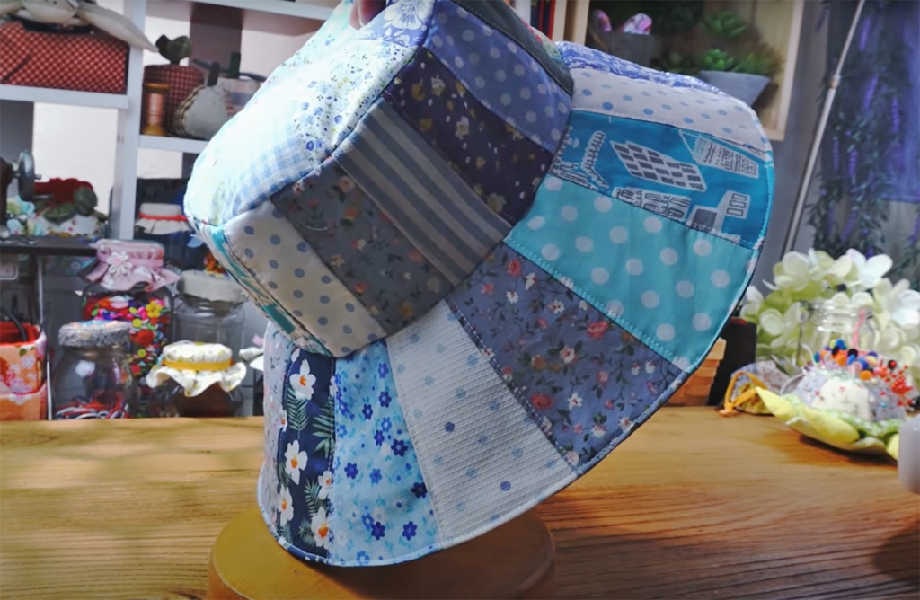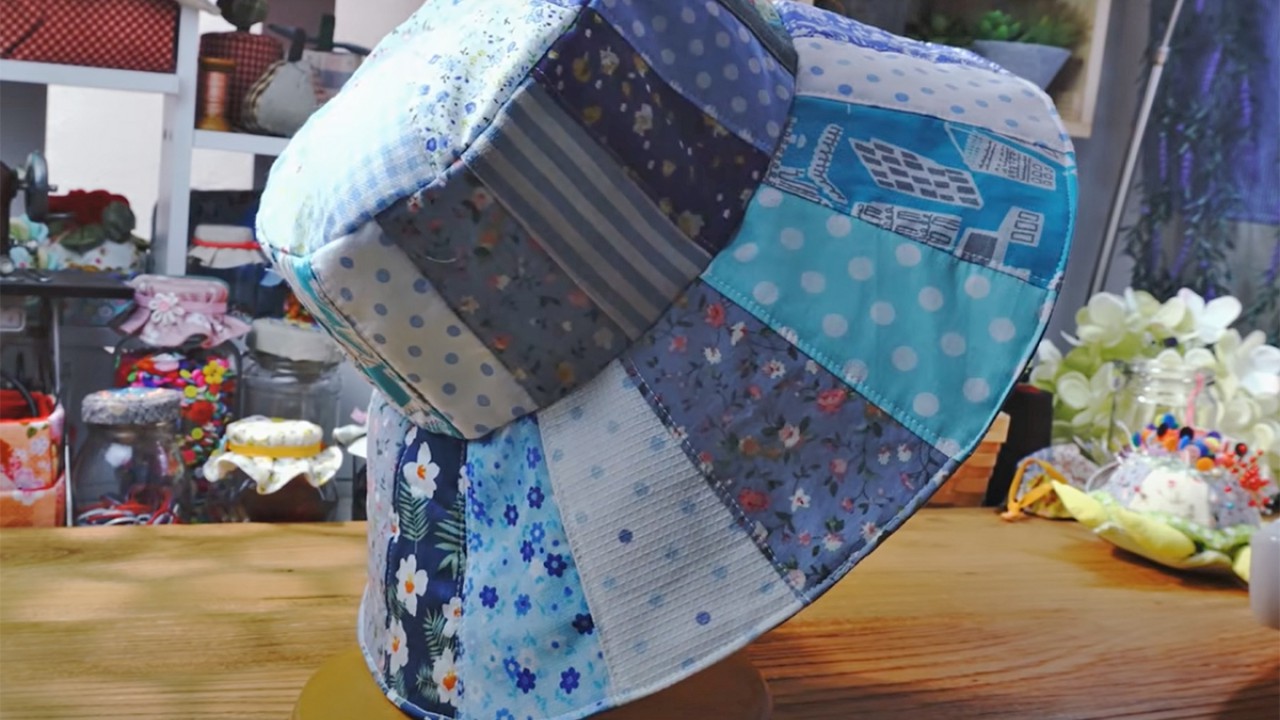 Ide kattintva töltsd le a sablont és vágd ki a kalap elemeit. A körformát oszd nyolc egyenlő részre, hajtogasd össze és ez alapján vágj ki a maradék textilekből háromszög formákat. Ezután egyesével varrd hozzá őket a merevítő anyaghoz a videón látható módon. A kalap oldalához szintén nyolc-nyolc kisebb darab textilre lesz szükséged, varrd fel őket egyesével a hozzátartozó merevítő anyaghoz. Végezd el ugyanezt a műveletet a kalap karimájával is és a darabokat (a tetejét, az oldalát és a karimáját) varrd össze.