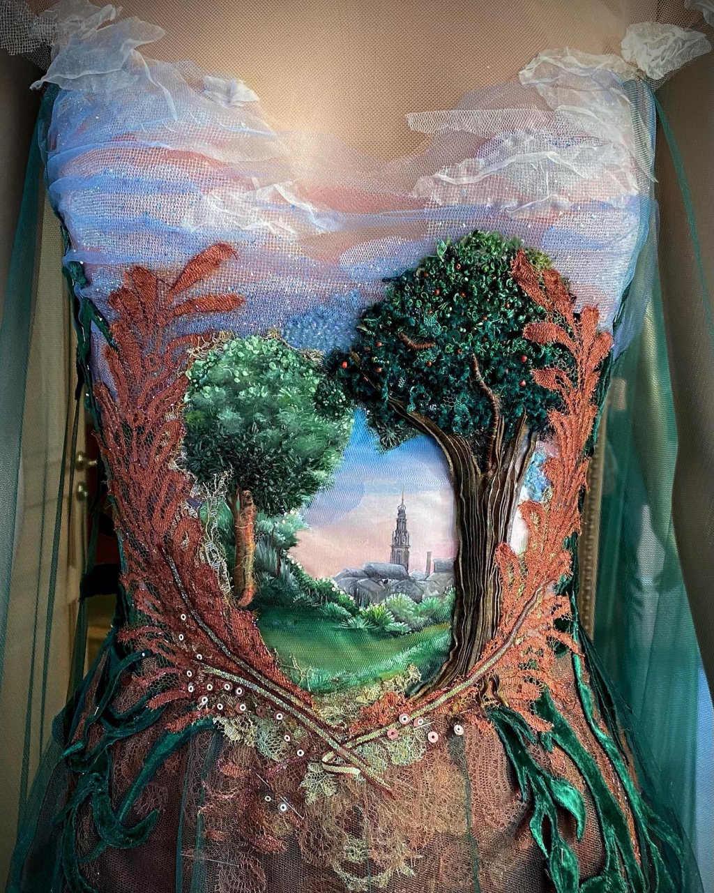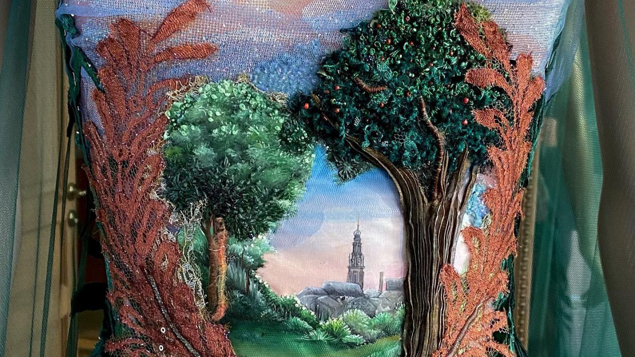 Sylvie Faconról korábban már írtunk: egy bájos francia kisváros ihlette egyik kollekcióját. A divattervező most újabb káprázatos darabbal állt elő, amivel közel nyolc napig dolgozott. A MyModernMet azt írja, a ruha témája ezúttal egy mesebeli táj, a felső része az égbolt, középen egy szürke templom, amit fák ölelnek körbe. Elképesztően aprólékos kidolgozás jellemzi, kézzel festette, hímezte, flitterekkel és gyöngyökkel díszítette. A ruhához egy leheletvékony smaragdzöld köpeny is tartozik.