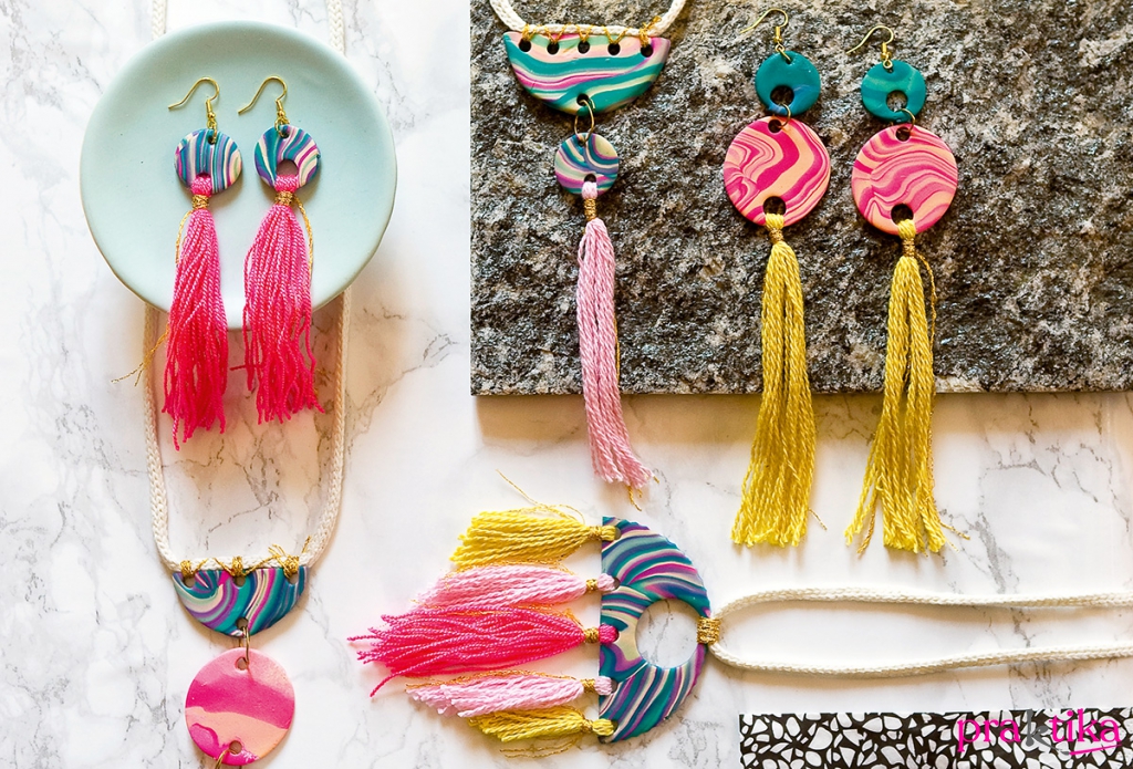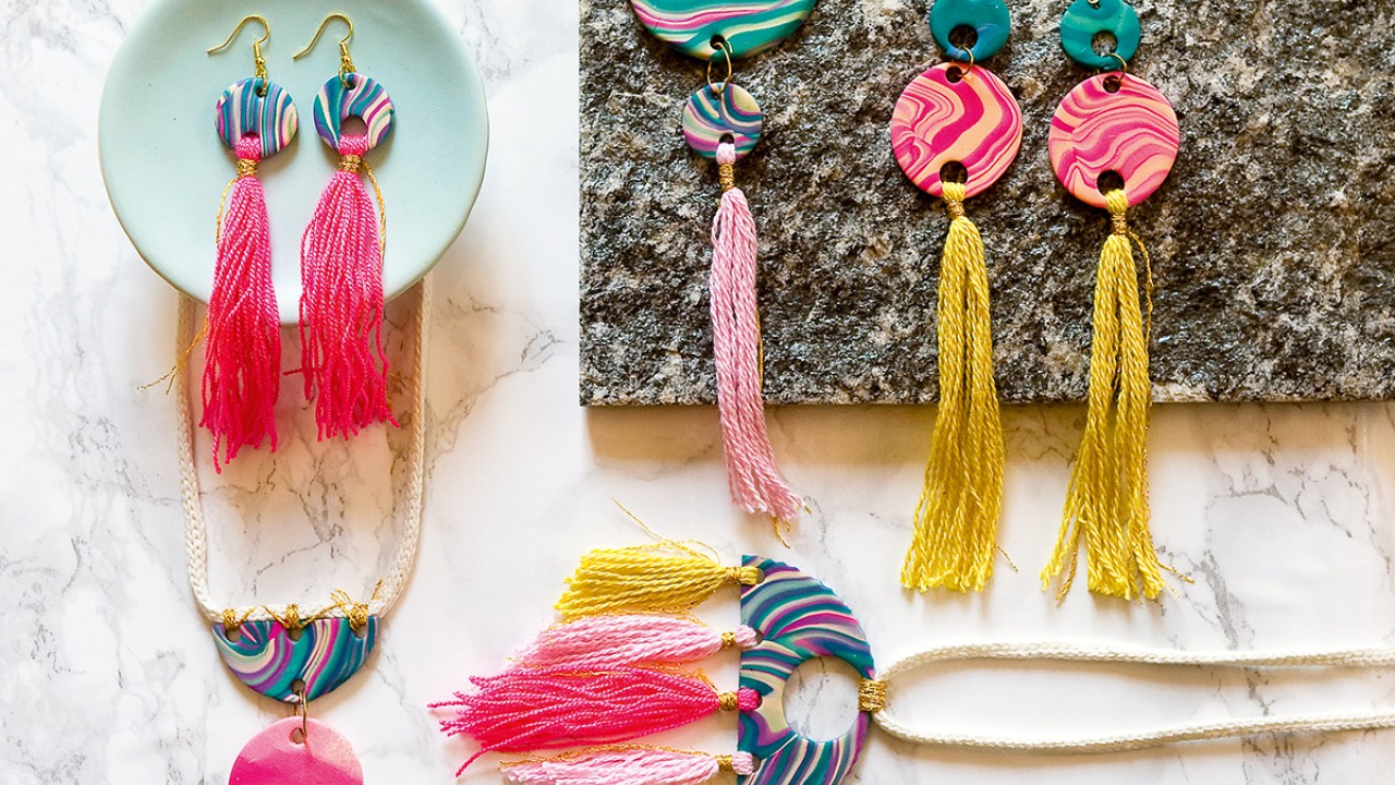 5. A nyaklánchoz a vastag makraméfonalat szintén aranyszínű hímzőszállal rögzítsd a gyurmaelemhez, de használhatsz drótkarikákat is. A makraméfonal két végére ékszerragasztóval vagy melegragasztóval rögzíts végzáró elemeket, majd azokhoz szerelőkarikával rögzíts delfinkapcsot. A fülbevalókhoz a fülbevalóalapokat szintén szerelőkarikával rögzítsd a gyurmaelemekhez.