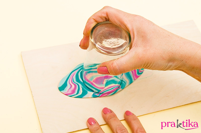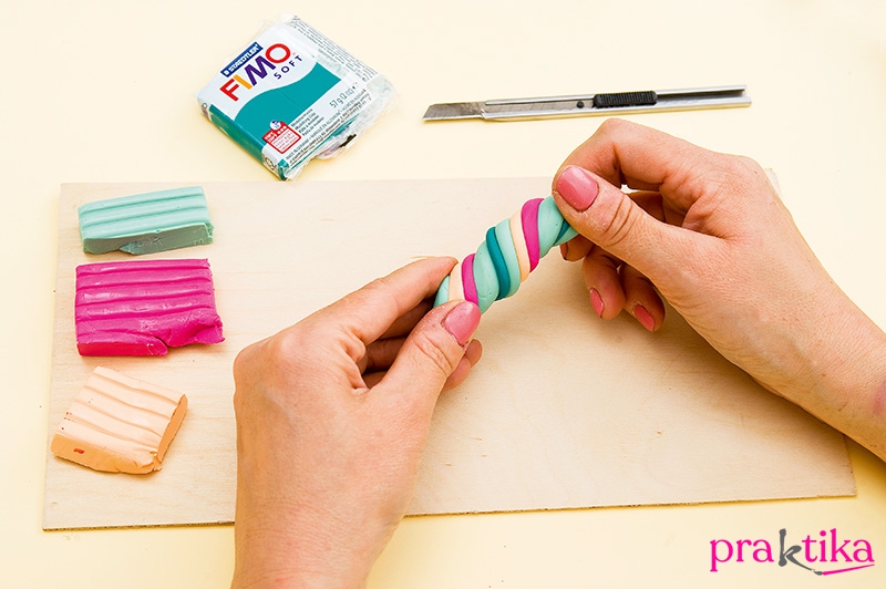 1. A négy különböző színű gyurmából vágj kisebb-nagyobb darabokat, és sodorj belőlük azonos hosszúságú hengereket. Nyomd össze őket egyetlen hengerré és tekerd meg többször. Sodord vékonyabbá, tekerd meg és sodord ismét vastag hengerré. Újabb vékonyítás és tekerés következik még két-három alkalommal, hogy megkapd az izgalmas, márványos hatást. Végül formázd gömbbé a gyurmát és nyújtsd ki kb. 2 mm vastagra fa- vagy szilikonlapon, műanyag sodrófával.