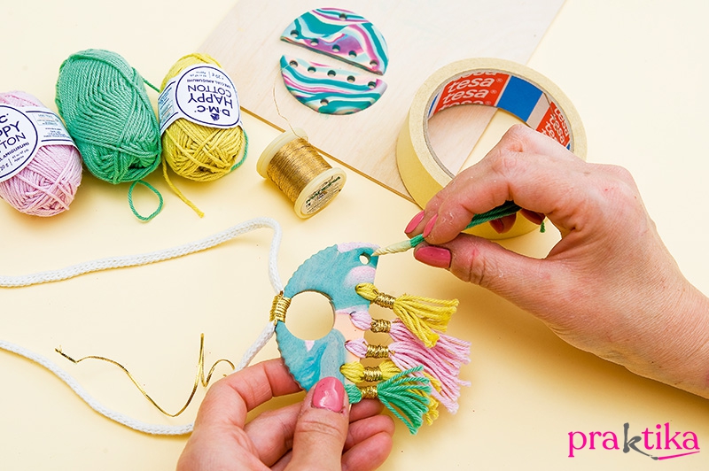 3. A fonal vastagságától függően fogj össze 5-10 szálat, a végeket ragasztószalaggal tekerd át, hogy könnyebb legyen a munka, és bújtasd át a köteget az egyik nagyobb lyukon. Aranyszínű hímzőszállal tekerd át a köteget többször, így alakítsd ki a bojtot, aminek vágd egyenesre az alját. Készítsd el a többi bojtot is.