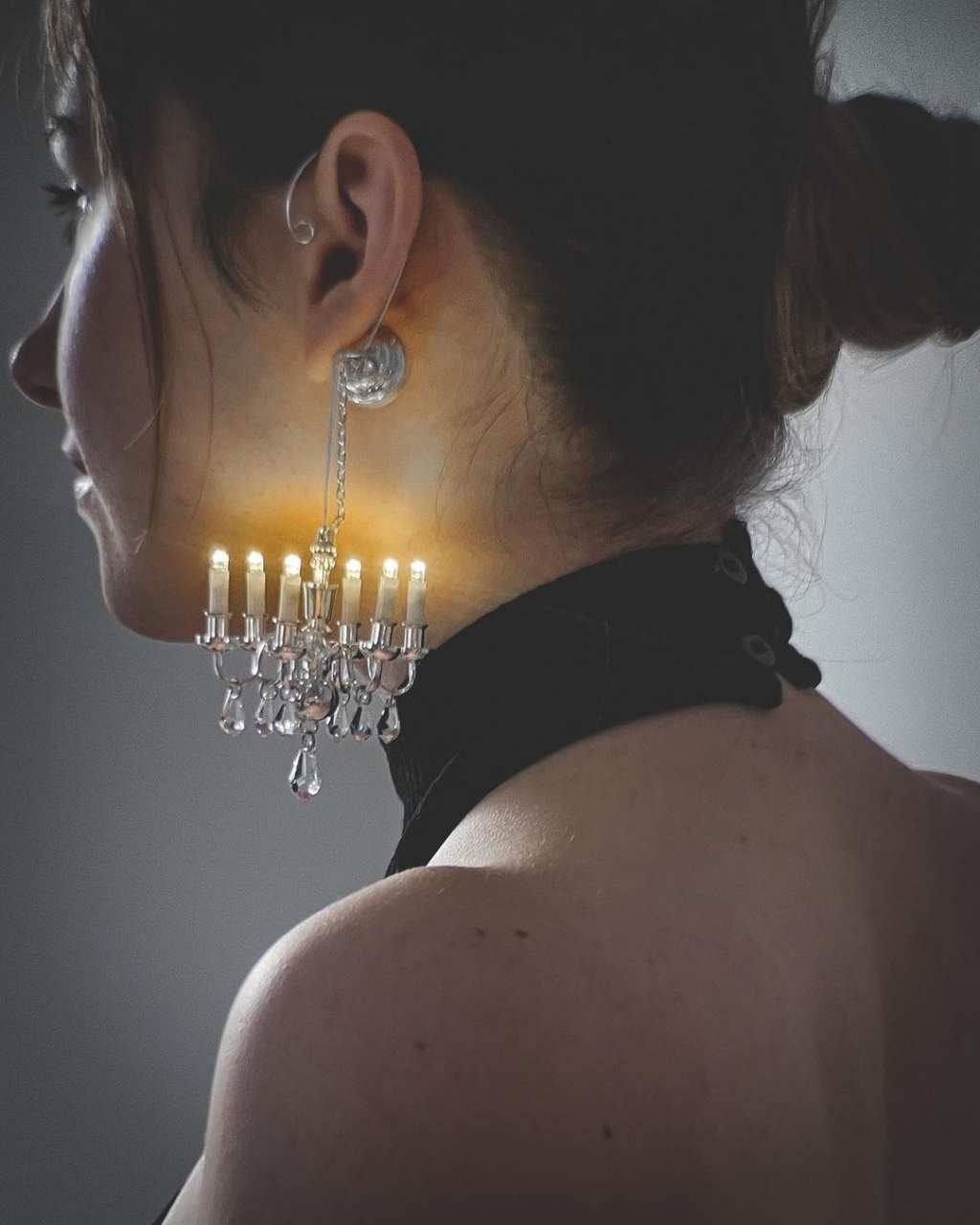 Diana Caldarescu dizájner egészen egyedi ékszereket tervez. A fülbe akasztható darabok csillár formájúak és a sötétben világítanak, mintha csak felkapcsoltuk volna őket. Valójában elemmel működnek, amelyek a fül mögött rejtőznek. Minőségi alapanyagokból készülnek, sárgarézből és Swarovski kristályokból – ettől függetlenül nem kell amiatt aggódnunk, hogy esetleg túl nehezek lennének.