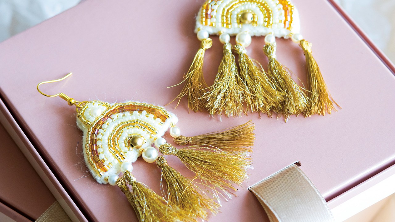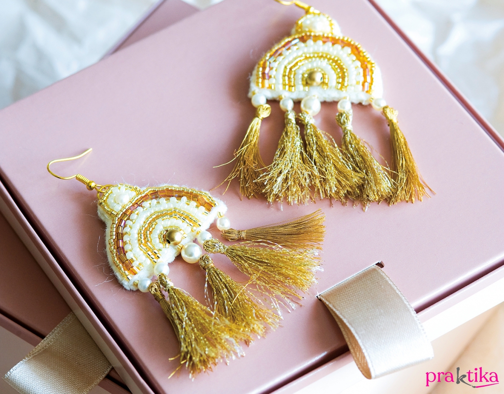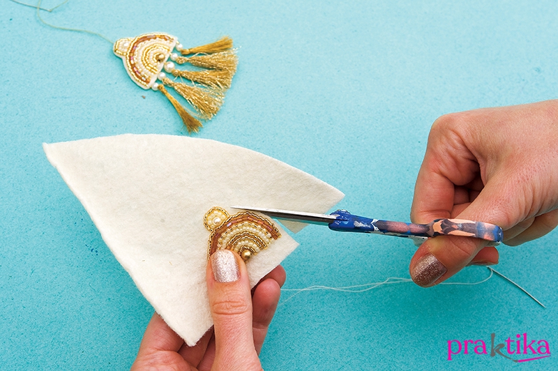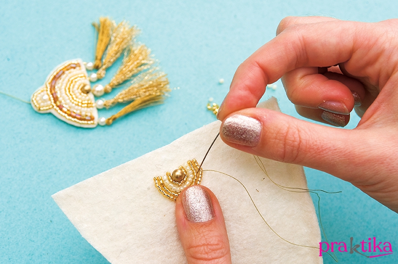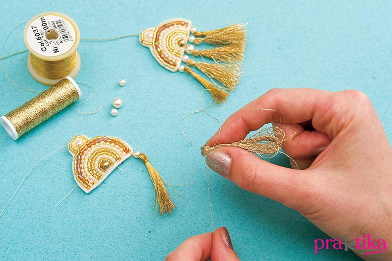 4. Készíts bojtokat aranyszínű hímzőszálból, és öltsd őket a fülbevaló aljához egy-egy szem gyönggyel kiegészítve. Felül pedig ölts a fonákoldalra arany karikát. Apró öltésekkel varrd össze a fülbevaló két felét. Szereld a karikára a fülbevalóalapot.