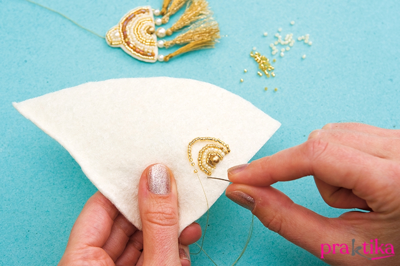 1. Öltsd fel egy darab filcre a nagyobb méretű arany gyöngyöt. Félkörívben készíts köré gyöngysort: vezesd a tűt az arany gyöngy mellett a színoldalra, fűzz fel 12 szem miyukit. Kanyarítsd a felfűzött sort a nagyméretű gyöngy mellé, és bökd a fonákoldalra a tűt úgy, hogy szépen szorosan keretezze a gyöngysor a középső nagy gyöngyöt. Minden második gyöngynél hozd fel a tűt a színoldalra, és erősítsd a filchez a gyöngysort.