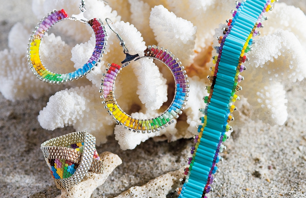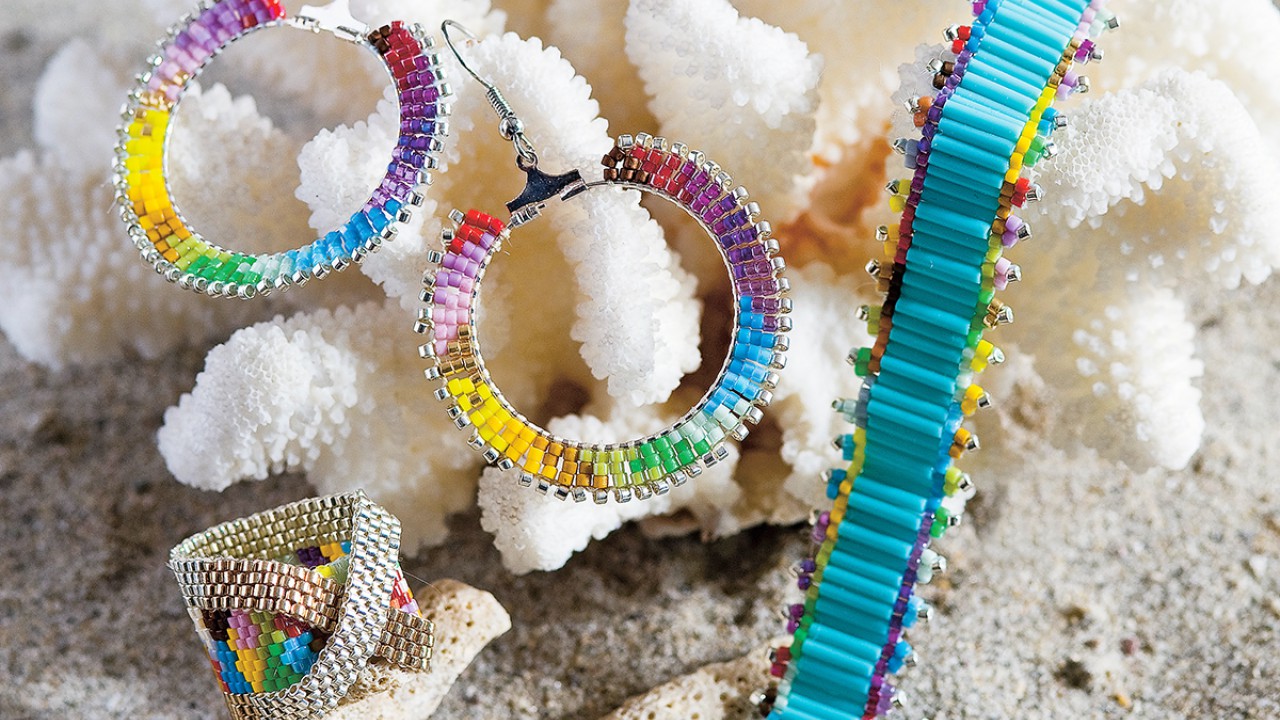 Hozzávalók • szalmagyöngy • kör alakú fülbevaló alap • fülbevaló-akasztó • szalag végzáró • ezüstszínű kapocs • színes, ezüst- és aranyszínű Miyuki Delica gyöngyök • gyöngyfűző cérna • gyöngyfűző tű, olló, lapos fogó, ékszerragasztó
