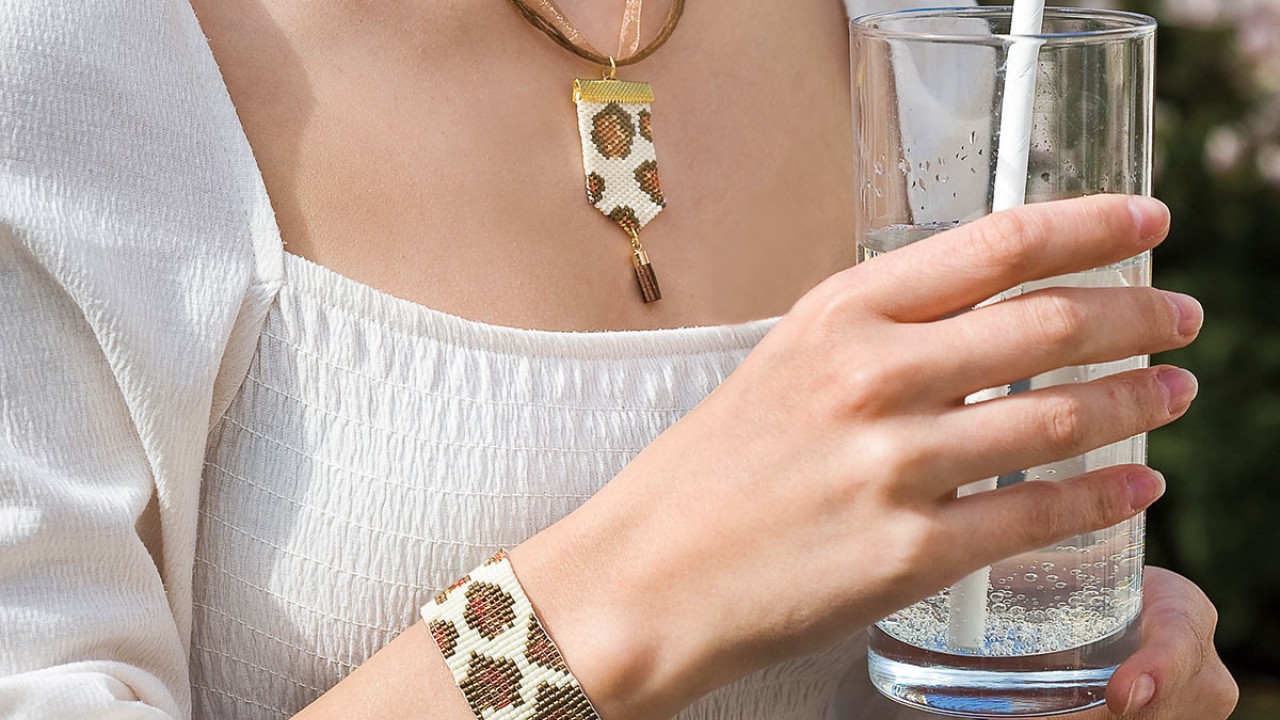 Hozzávalók • 1-1 csomag japán gyöngy, 11/0 méret: opak matt vajsárga, ezüst közepű narancsvörös, matt metál bronz, ezüst közepű füsttopáz • barna szalagos nyaklánc alap • 1 db barna bőr bojt • 3 db aranyszínű szalagvég, 25 mm • aranyszínű karkötőkapocs, lánc, szerelőkarikák • gyöngyszövő keret • laposfogó, olló, gyöngyfűző tű, gyöngyfűző cérna • ékszerragasztó vagy melegragasztó