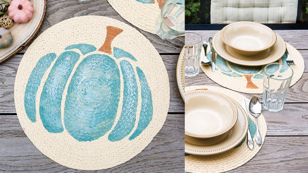 Amilyen egyszerű elkészíteni, olyan látványos ez a tökkel díszített tányéralátét. Ha még izgalmasabb látványra vágysz, a fehér mellett egy sötétebb zölddel vagy szürkével is árnyalhatod a cikkek széleit. Tengerifű helyett más, természetes alapanyagú tányéralátétet is választhatsz, sőt, akár textilt is mintázhatsz.