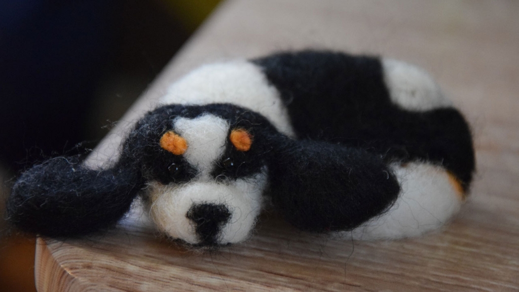 „Személyre szóló apróságként készült ez a kutyusos könyvjelző, illetve egy akasztós változat, a kutyus nevének kezdőbetűjével, kedvenc tűnemezelt, hímzett virágos technikámmal.”