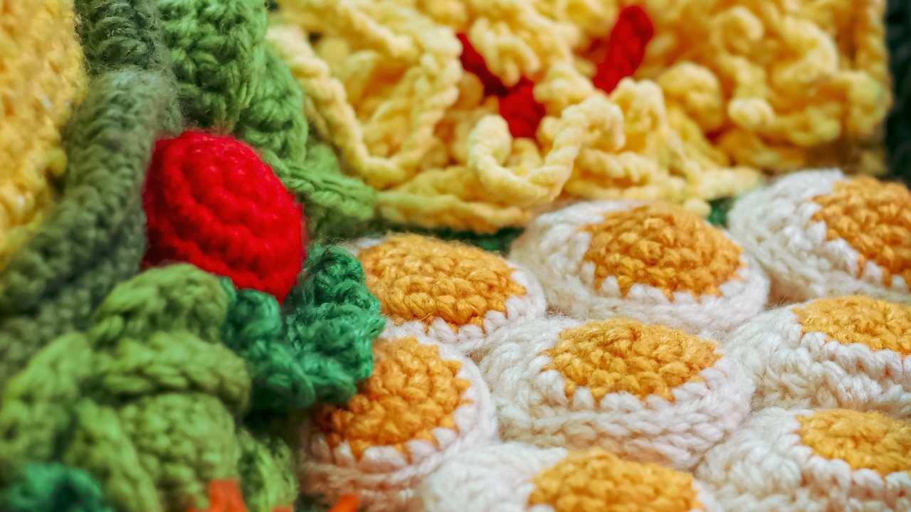 Carly D. különleges világot teremt horgolótűvel és fonalakkal: ételei finoman megidézik a reggeli asztal hangulatát. Munkái között ott sorakozik a pirítós, a bacon, a tükörtojás, de találkozhatunk avokádóval, paradicsommal vagy barackkal is.