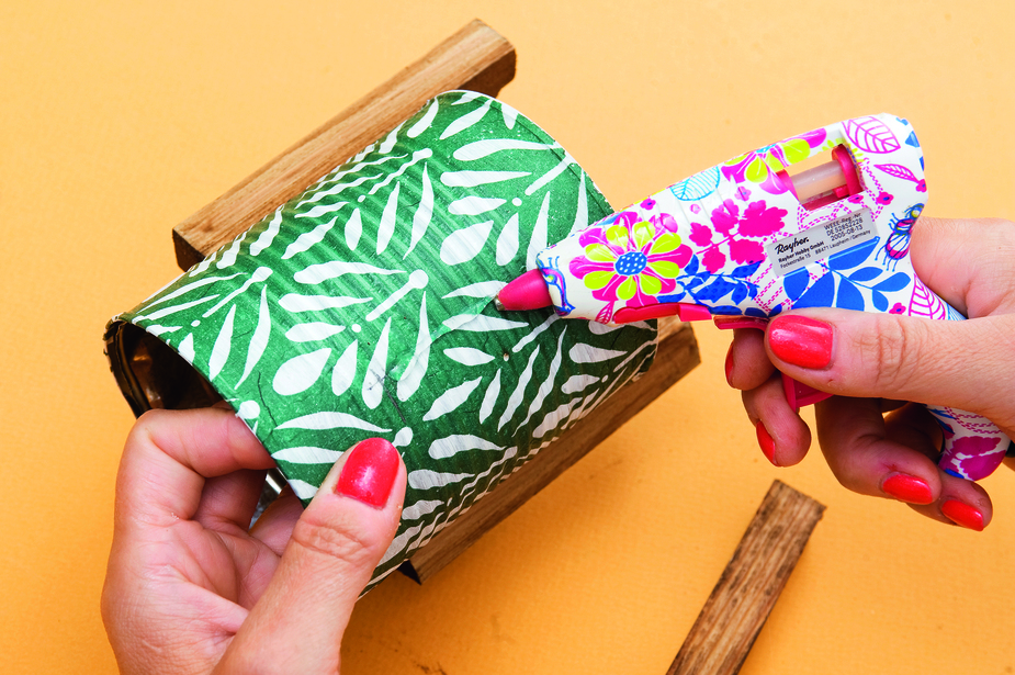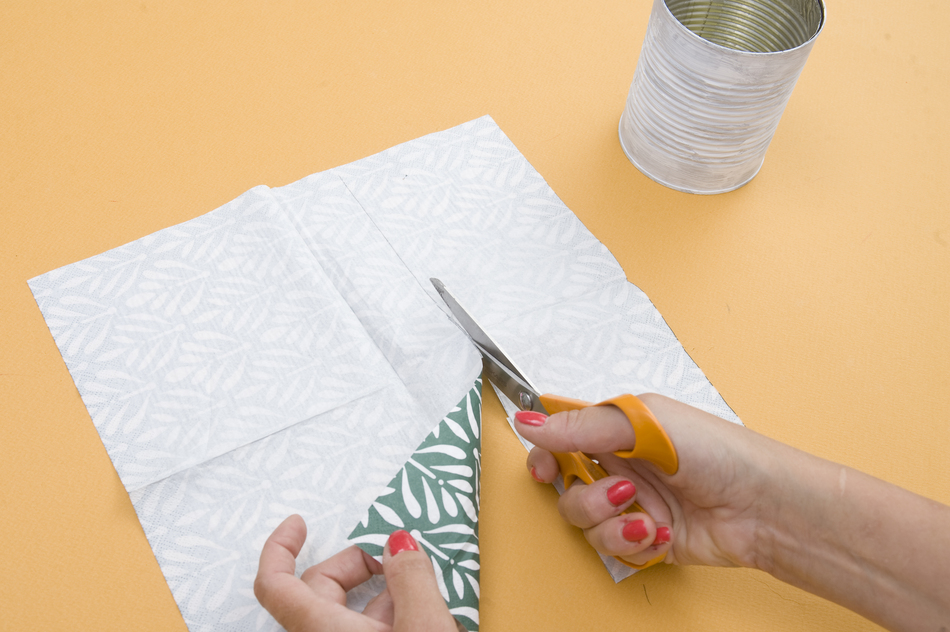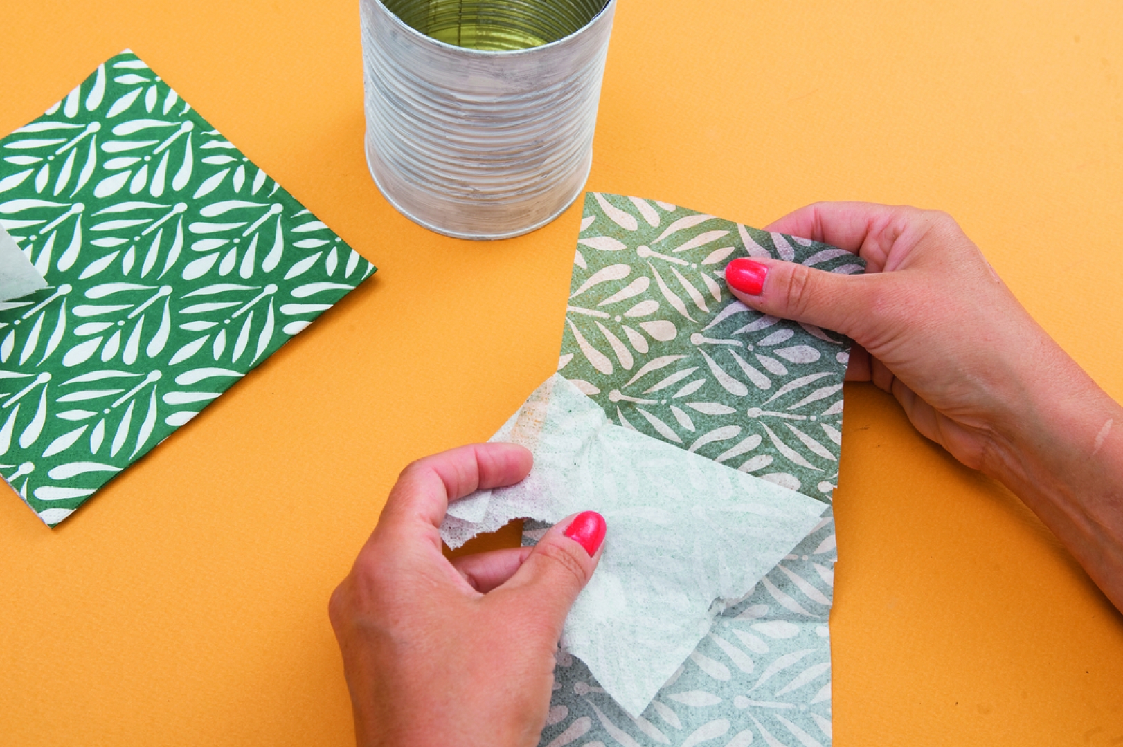 - Távolítsd el a szalvéta hátsó, fehér rétegeit. A felső, színes-mintás réteget borítsd a konzervdobozra, és kenj rá enyhén hígított dekupázsragasztót, középről a doboz alja és teteje felé haladva, így simítva rá a szalvétát a felületre. Ne simogasd túl sokat, mert akkor elszakadhat a szalvéta! Száradás után kenj rá még egy réteg dekupázsragasztót, ezzel tartósabbá teheted a felületet.