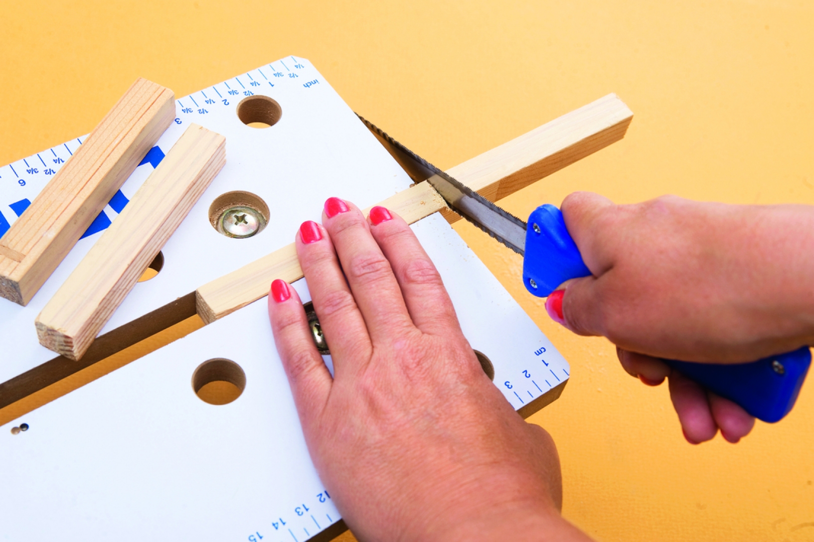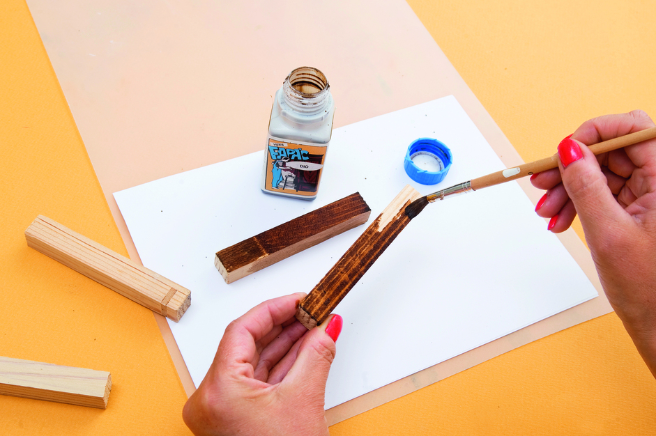 - A falécet fűrészeld három egyforma hosszúságú darabra, ezek lesznek a kaspó lábai. Pácold őket barnára, majd hagyd megszáradni.