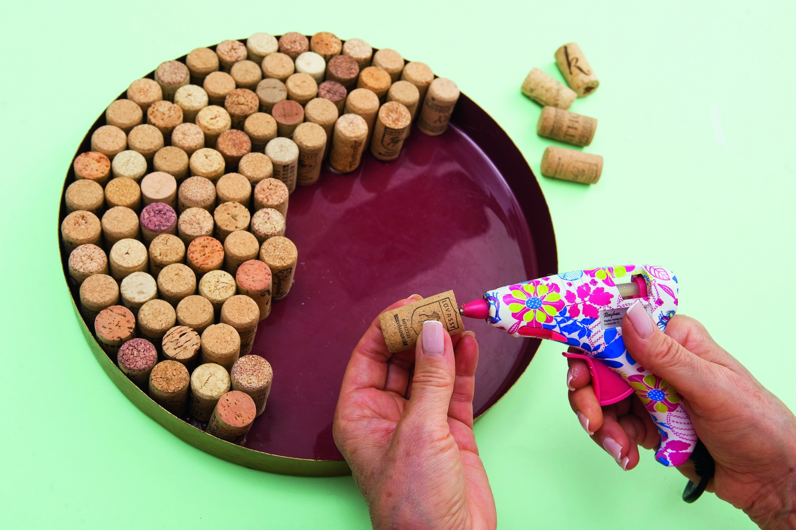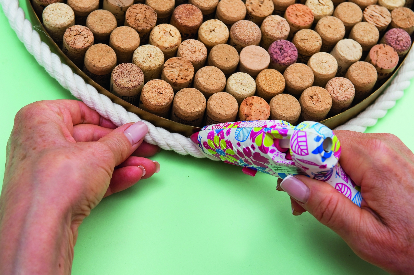 - Melegragasztóval rögzítsd egyenként, állítva a dugókat. Az aljukra nyomd a ragasztót, és illeszd őket szorosan egymás mellé. A tálca pereme felől haladj befelé. Az utolsó darabokat, ha szükséges, kicsit meg is faraghatod, hogy beférjenek.