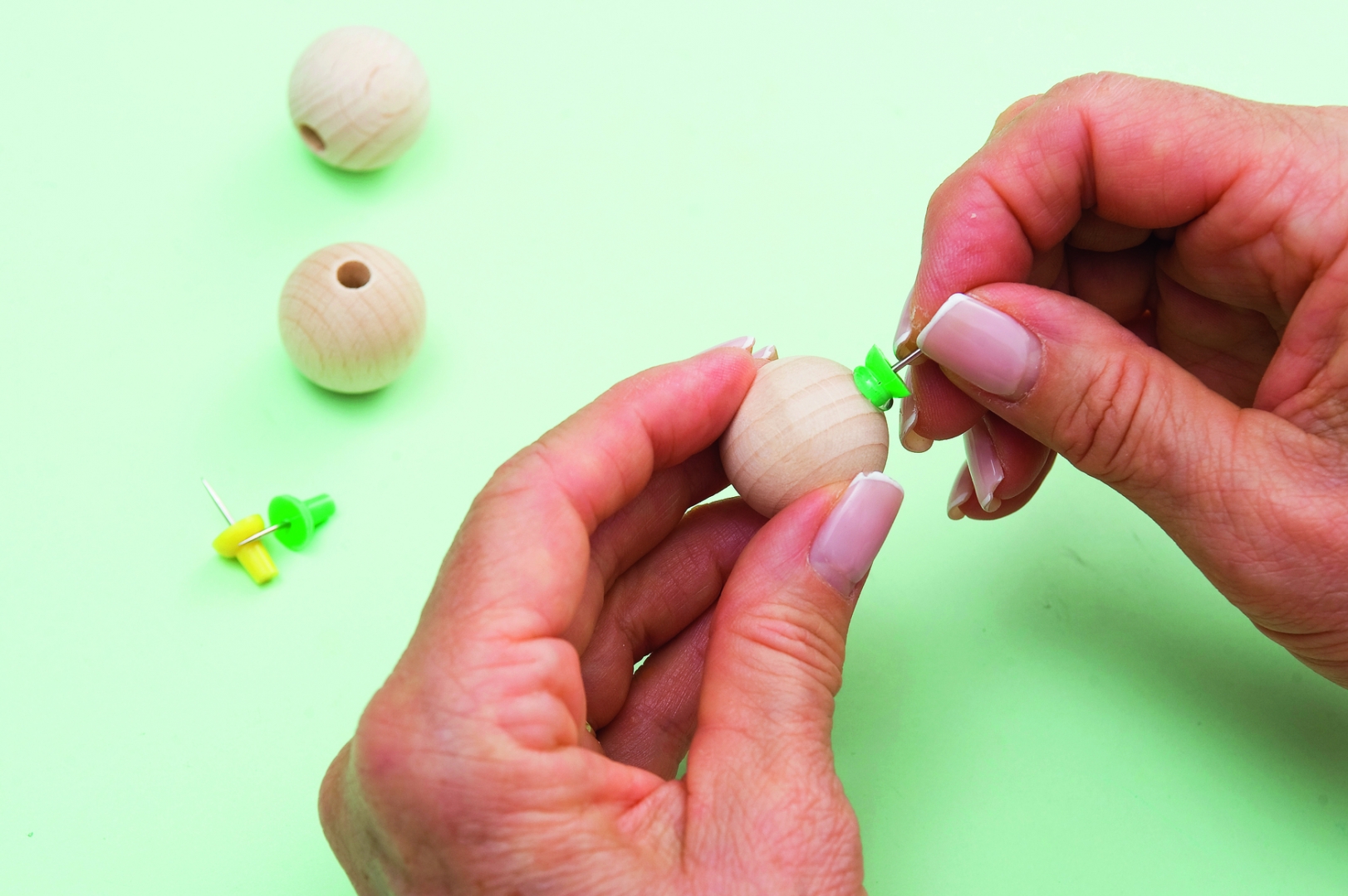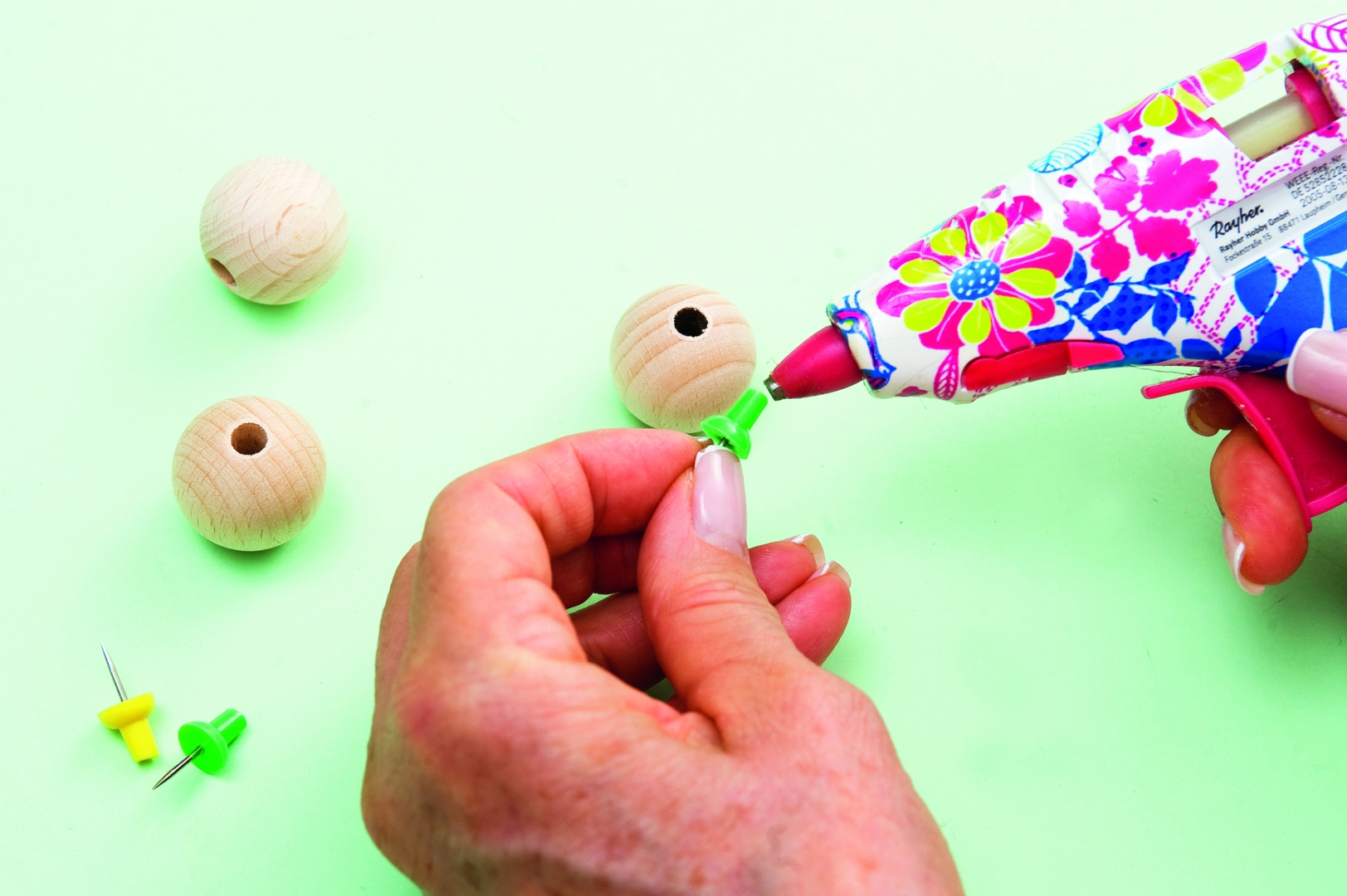 - A térképtűket dekorálhatod a fagolyókkal. Ehhez csípőfogóval csípd le a tűk műanyag végét, tegyél rájuk melegragasztót, és nyomd a golyók egyik lyukába.
