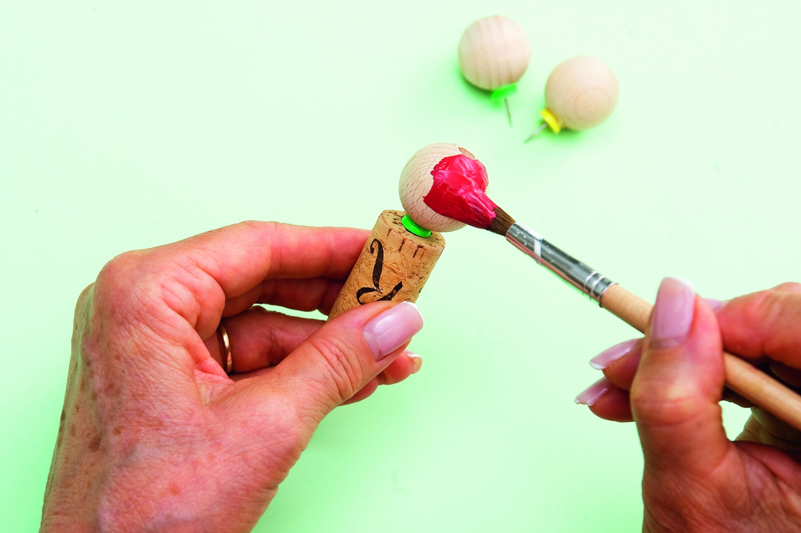- Fesd le a golyókat bordó, törtfehér és pasztellbordó színűekre – ez utóbbit kikeverheted, ha a törtfehérbe teszel egy csepp bordót. Szúrd a tűt egy dugóba, így kényelmesen le tudod festeni még a műanyag részt is. Befejezésül a golyók még látható lyukába rögzíts melegragasztóval egy-egy teklagyöngyöt.