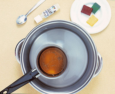 A szappantömböt kb. 5 perc alatt, forró vízzel teli lábasba merített edényben vagy mikrohullámú sütőben kell felolvasztani, de forralni nem szabad! 600 W-ra állított mikróban 10 dkg-nyi tömb kb. fél perc alatt melegszik fel, de jó, ha figyelemmel kísérjük a tömb olvadását. A szappanalap sűrű, de ne hígítsuk vízzel, mert nem fog összeállni!