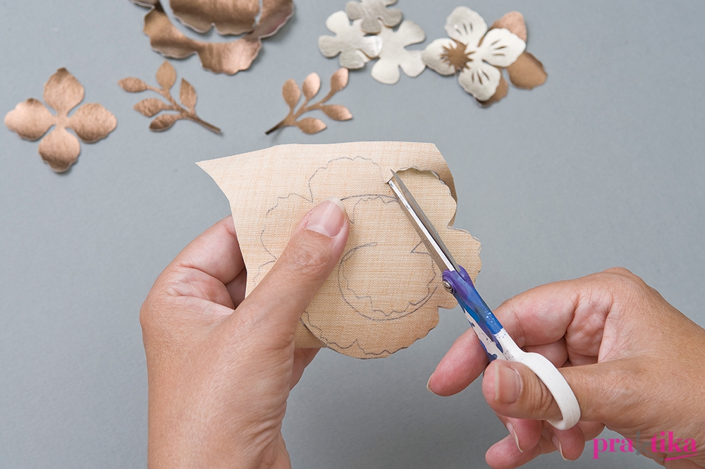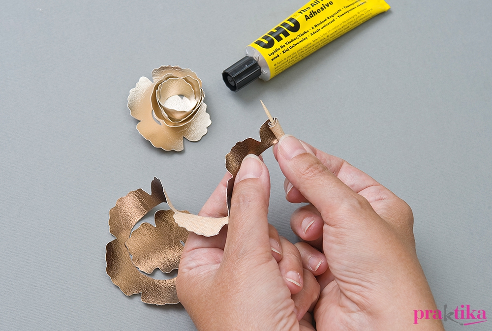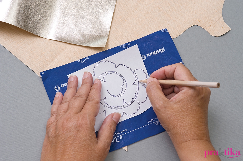 Rajzold indigóval a virágmintákat a műbőr hátoldalára, vágd ki és fogvájóra hajtva tekerd fel úgy, hogy alul helyenként megragasztod.