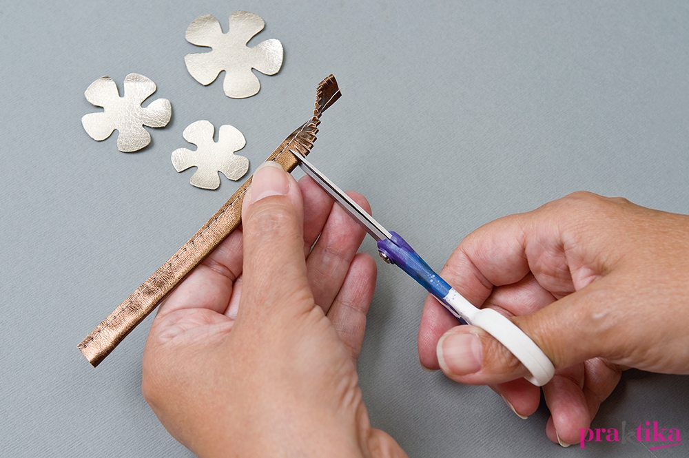 Állítsd össze a virágokat, ragaszd egymásra a részeket. Virágközepet úgy készíts, hogy egy 8x1 cm-es műbőr csíkot hosszában összehajtva végigvarrsz, majd keresztben apránként bevagdosod, végül feltekered és megragasztod. A kész elemeket ragaszd a karkötőre.