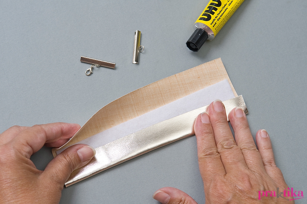 A karkötőhöz szabj a csuklód méretének megfelelő hosszúságú 7 cm széles műbőr csíkot és ugyanolyan hosszú és 3 cm széles filcet. Borítsd be a filcet a műbőrrel. A két végére szerelj szalagvégzárót és arra karikával delfinkapcsot. A karkötő pántját ragasztás közben igazítsd egy hengeres tárgy köré, így gyűrődésmentesen veszi fel a formát.