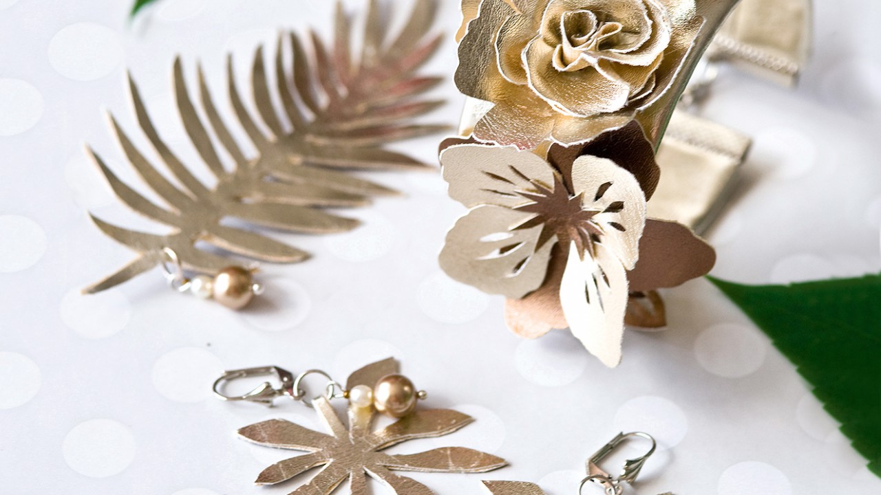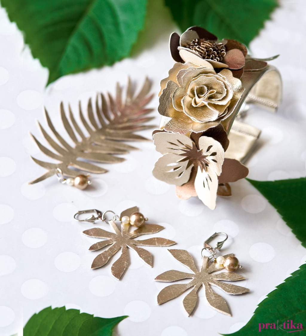 A fülbevalóhoz és kitűzőhöz duplán vágd ki a műbőrből a formát (másodszor tükrözve) és ragaszd össze, majd szerelj rá bross- vagy a fülbevalóalapot, dekoráld szerelőpálcára fűzött gyöngyökkel
