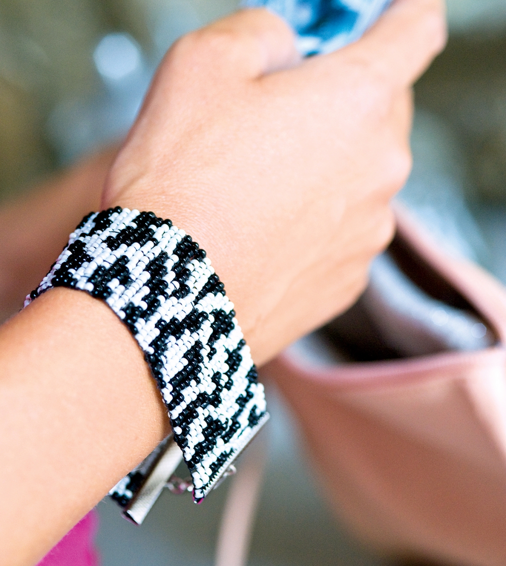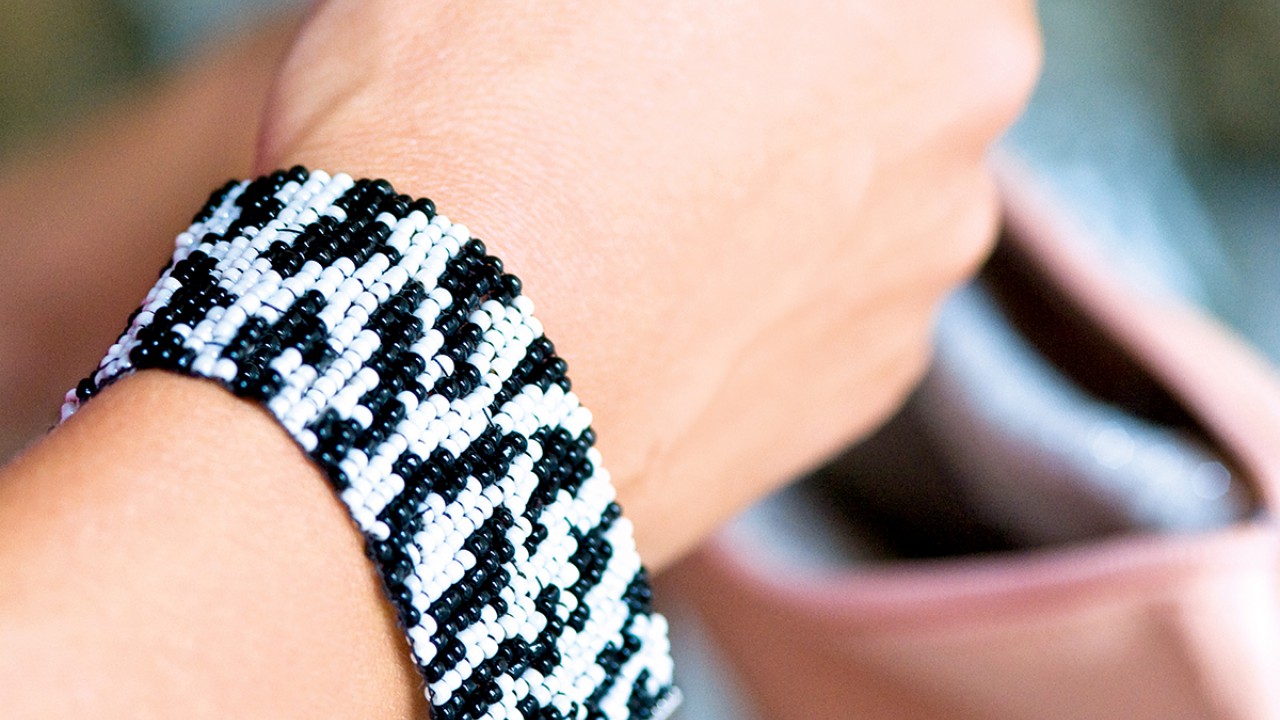 Nem mindennapi ötlet a zebrák szabálytalan csíkjait gyöngyökből kirakni, mégsem nehéz, mert csak két szín kell a széles karkötőhöz. Az apró kásagyöngyök szépen kiadják a mintát, érdemes a jobb minőségű, egyforma méretűeket beszerezned, azokkal lesz igazán szép, egyenletes a karkötő.
