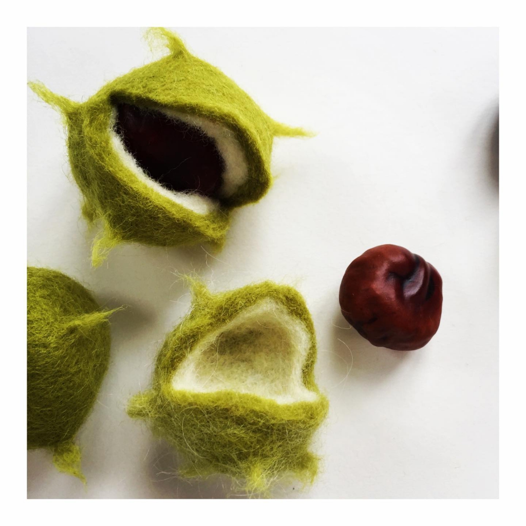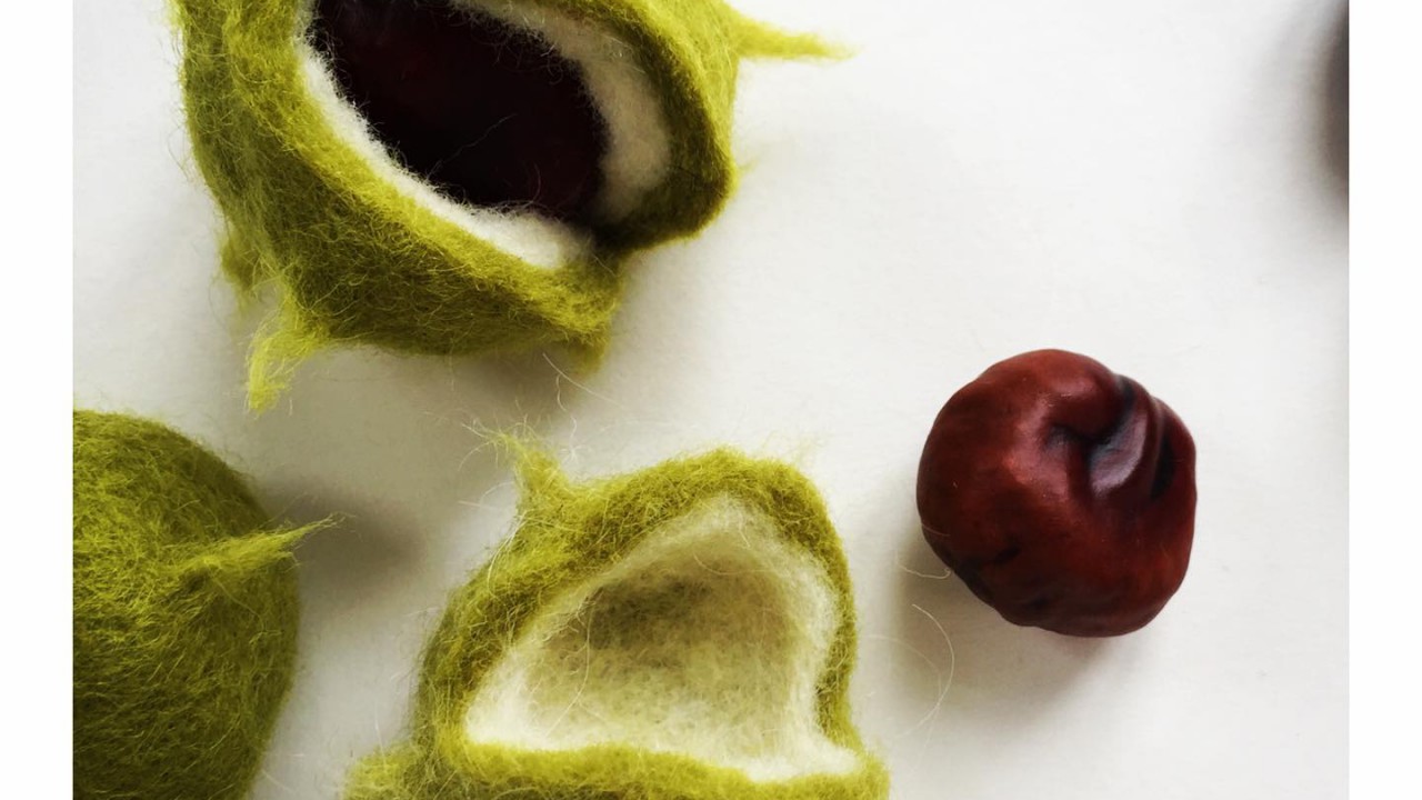 A gesztenyéhez készítsünk egy kemény magot: maréknyi gyapjút nyomjunk össze, és egyenletesen, jó szorosan több irányból tekerjük be gyapjúcsíkokkal. Amikor 5-6 cm átmérőjűre hízott a golyó, kezdjük ráborítani a barna réteget. Fogjuk szorosan két markunkba a labdát, és így nyomjuk meleg vízbe, amíg megszívja magát. Szappanozzuk be a kezünket, és finoman nyomkodjuk, forgassuk két tenyerünk között a golyót, de csak apró mozdulatokkal. Addig ne gömbölygessük, amíg kissé össze nem áll. Amikor érezzük, hogy a felső réteg már nem mozog, kezdhetjük a gömbölygetést, majd ahogy a golyó keményedik, a kissé erősebb gyúrást. Amikor a labda már szép formát öltött, a külseje elég tömör, de még két ujjal könnyen összenyomható, tegyünk egy fehér foltot – két vékony gyapjútépést – az egyik oldalára, és nemezelő tűvel szurkáljuk a helyére.