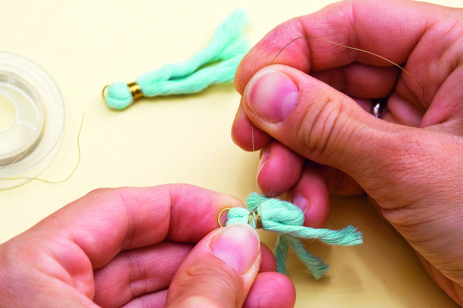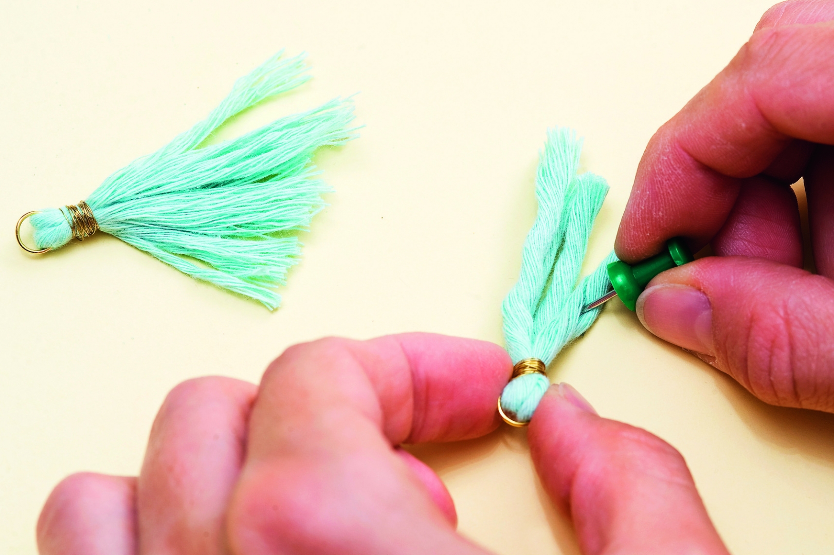 - Makraméfonalból készíts minibojtokat: a fonalból vágj le kb. 5 cm hosszú darabokat. Tetszés szerint 1-2 szálat fűzz át egy szerelőkarikán, majd hajtsd félbe őket. Ha a szerelőkarika végei nem illeszkednek pontosan, laposfogóval nyomd össze őket. Aranyszínű dróttal tekerd körbe néhányszor a fonaldarabokat a képen látható módon, majd az így kapott bojtot sűrű fogú fésűvel vagy rajzszeggel fésülgesd, hogy szétváljanak a szálak. Ezután ollóval vágd a kívánt méretűre a bojtot.