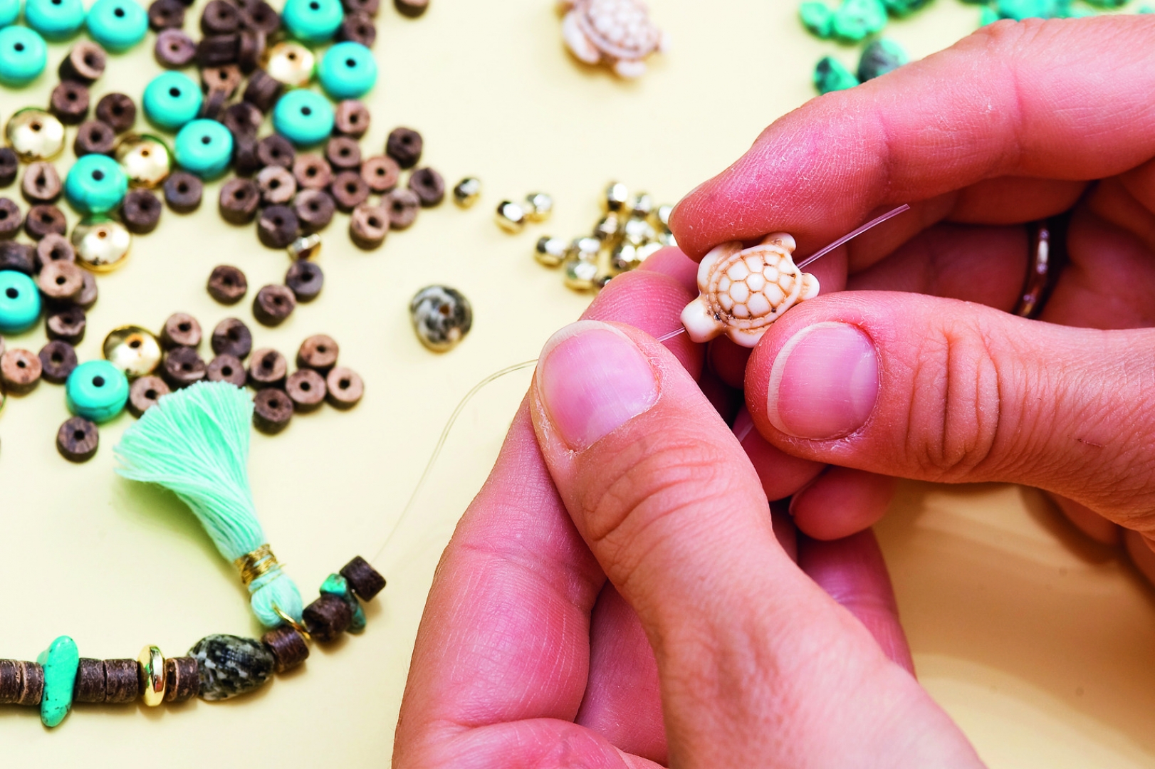 - A karkötő elemeit tedd ki magad elé az asztalra, és tervezd meg, milyen elrendezés tetszene. Fűzd fel a gyöngyöket, teknősöket, kagylókat, hematit korongokat, splittereket és bojtokat egy akkora darab gumis damilra, amely kényelmesen körbeéri a csuklódat. Így nem kell majd csatot használnod. Kösd össze a damil két végét, és szorosan csomózd is meg. Rejtsd el a csomót az egyik nagyobb lyukkal rendelkező gyöngy belsejébe.