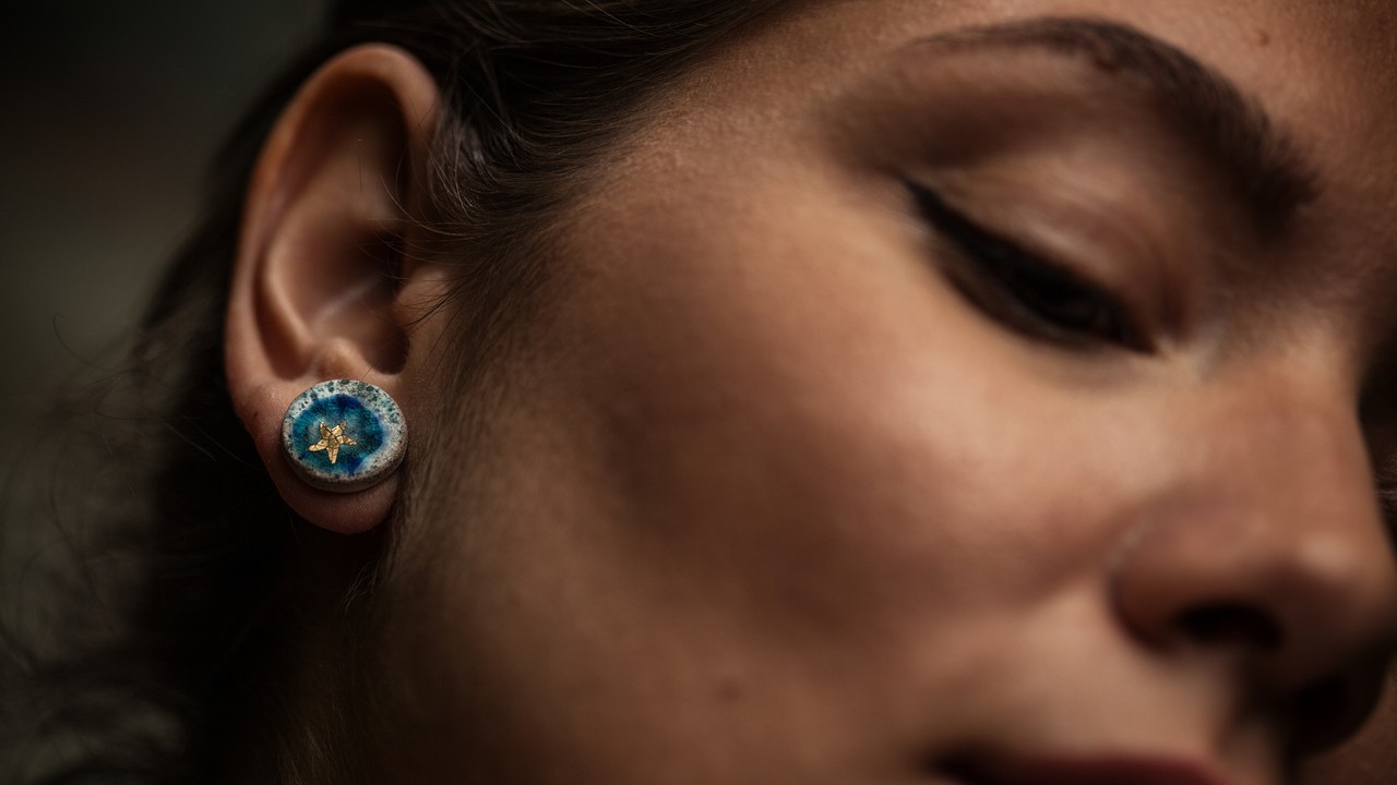 A finom egyenetlenségek és apró eltérések nála nem hibák, hanem a kézműves jelleg természetes velejárói. Formavilága letisztult, mégis határozott, sok ékszere inkább apró műtárgyként működik, mint klasszikus gyűrűként vagy fülbevalóként.