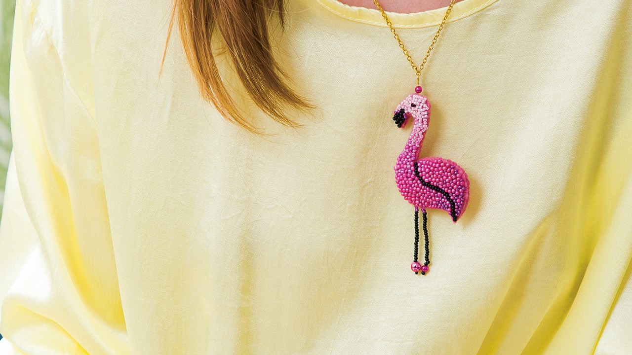 Vágd ki kétszer a flamingót filcből. A csőrét és a szárny vonalát fekete gyöngyökkel varrd ki. Hímezd ki az egyik testet rózsaszín gyöngyökkel. Kezdd a legvilágosabbal, és fokozatosan keverj hozzá az eggyel sötétebb színből. Majd egy idő után az első színt el is hagyhatod. Haladj így a legsötétebb árnyalat felé, hogy színátmenetes hatást érj el.