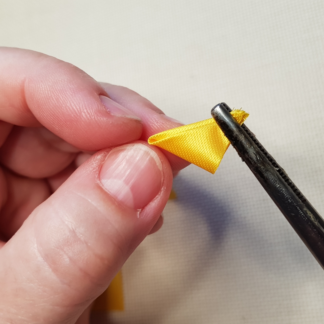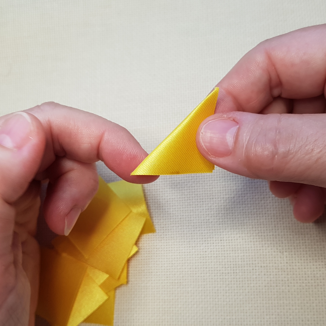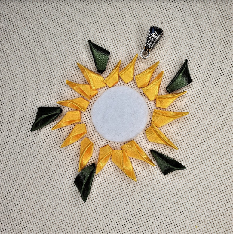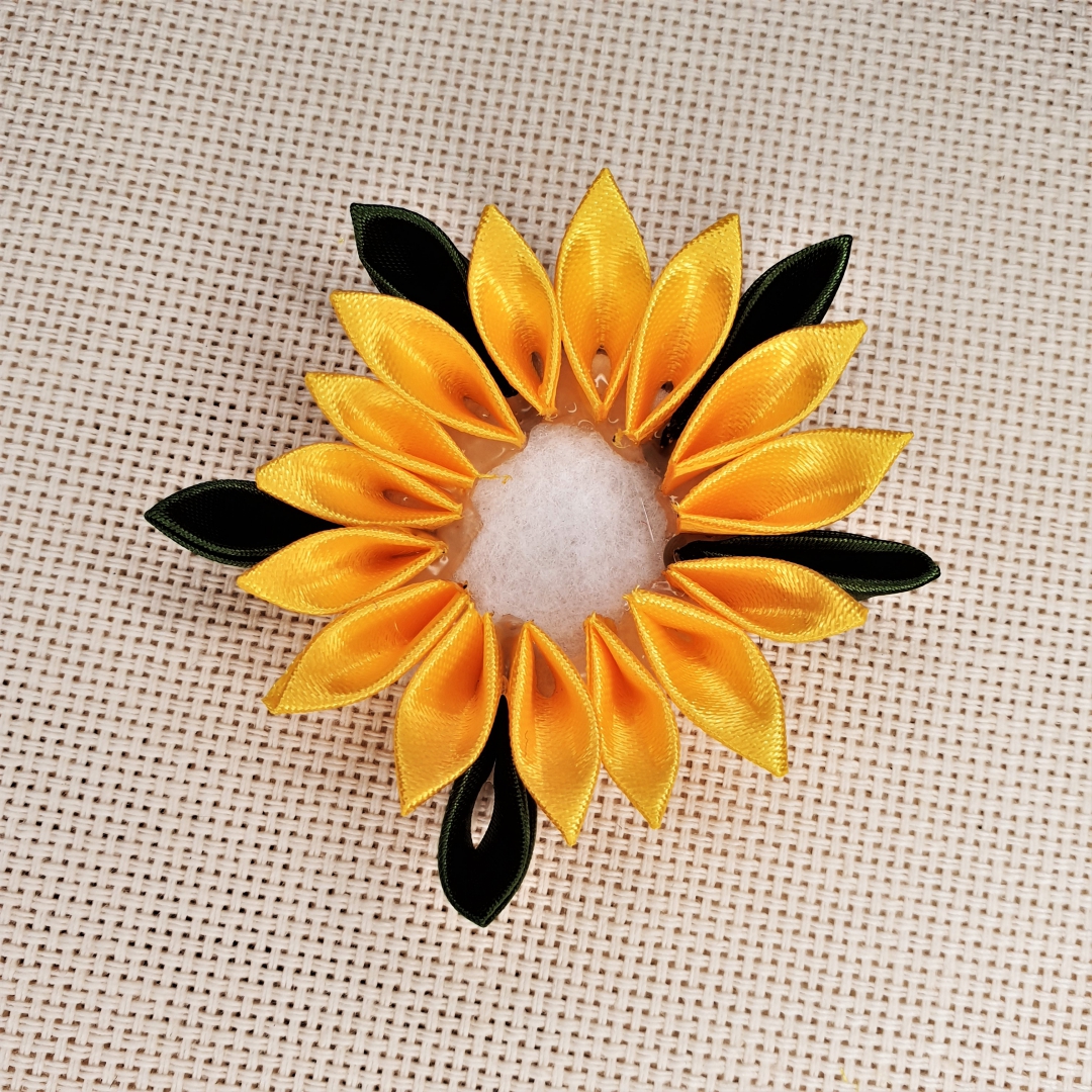 A napraforgós medálhoz kanzashi alaphajtogatással készülnek a szirmok és a levelek, melnyke lépései a következők: