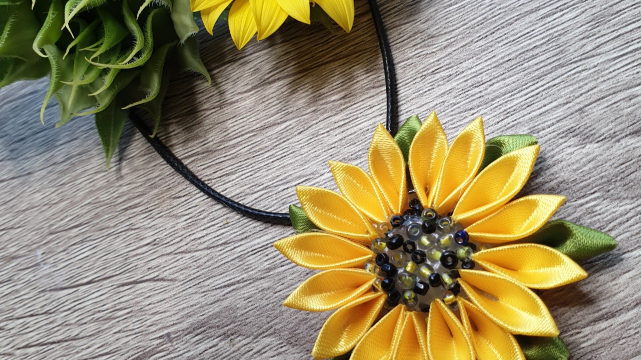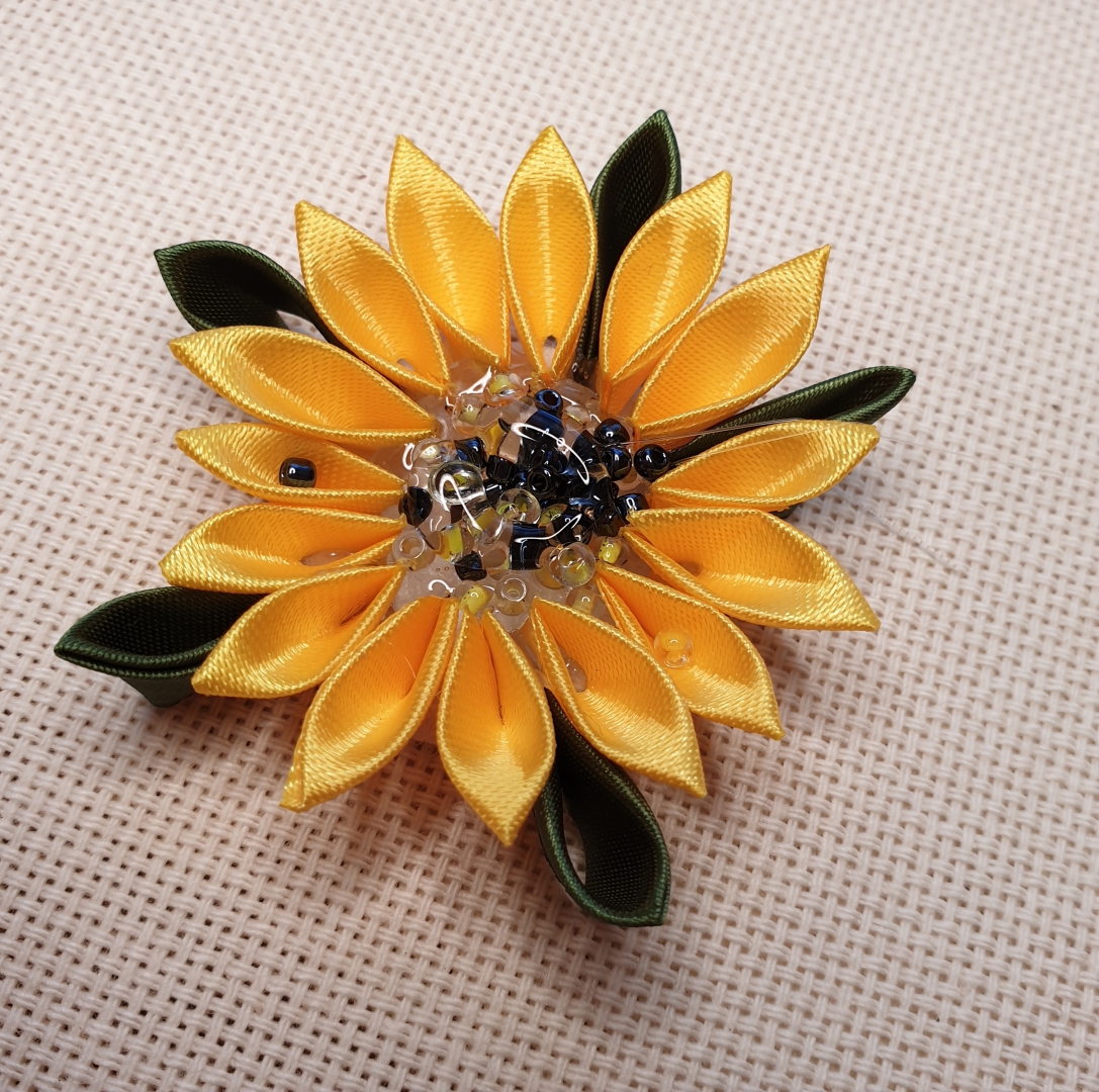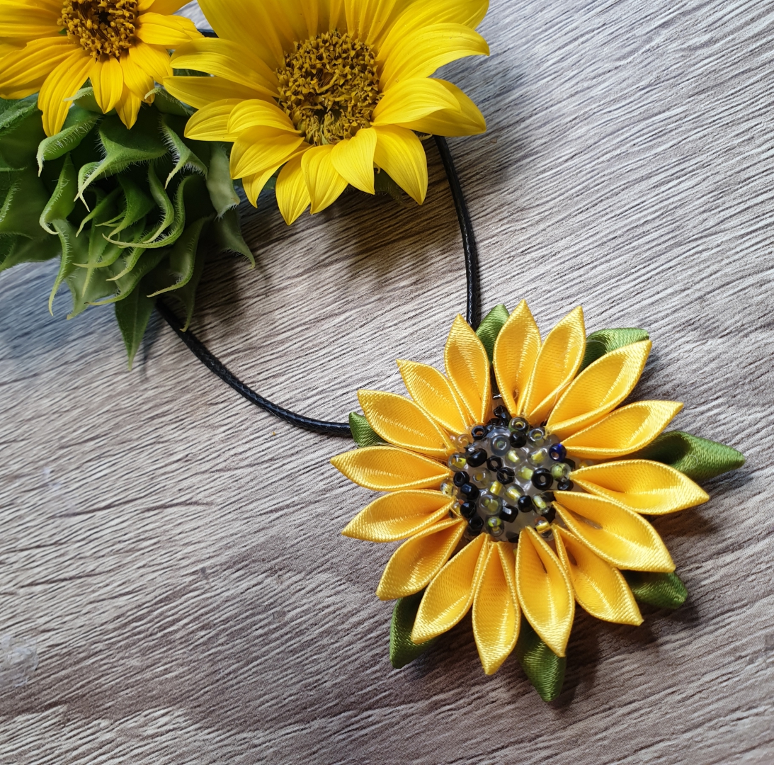 A napraforgós medálhoz kanzashi alaphajtogatással készülnek a szirmok és a levelek, melnyke lépései a következők: