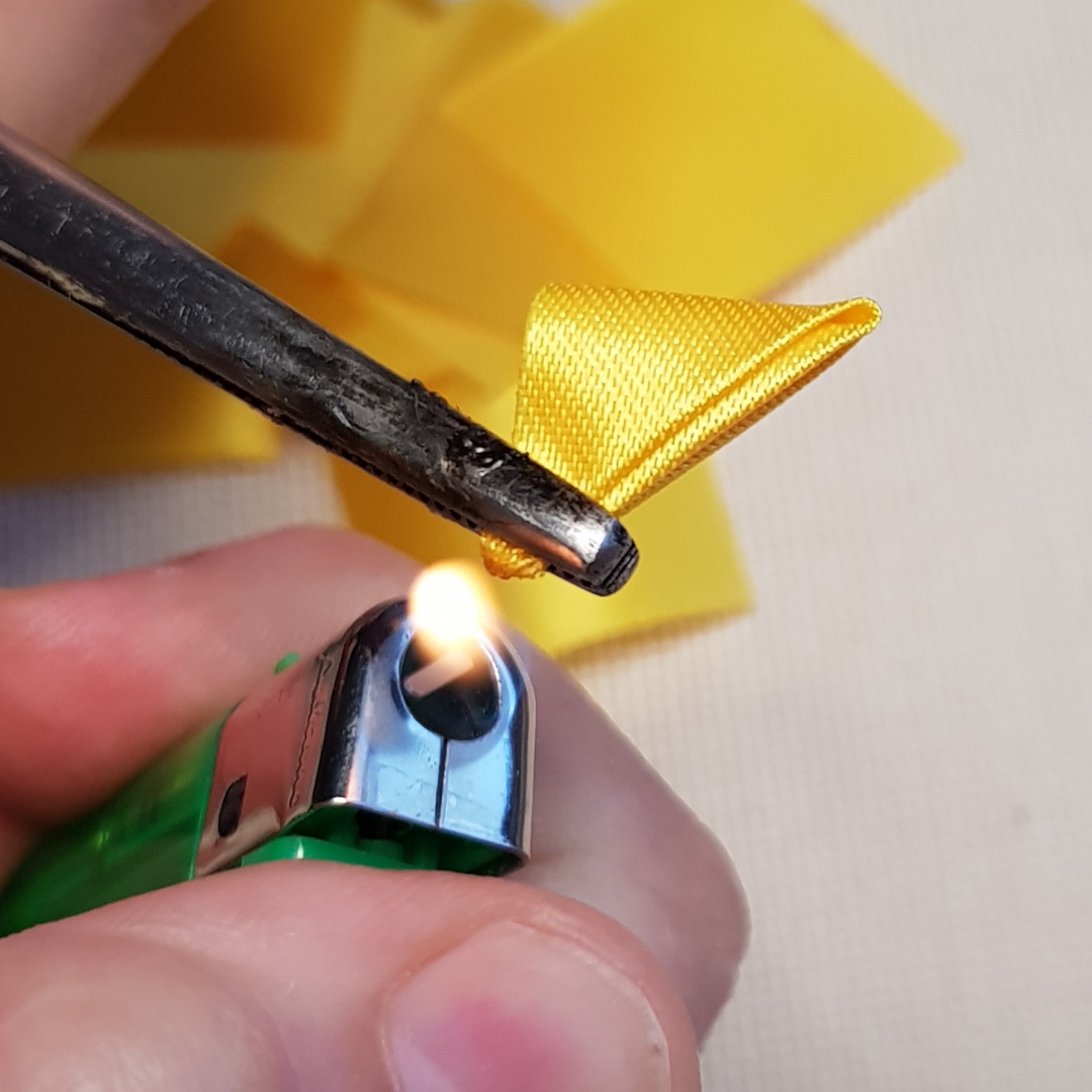 A négyzetet hajtsd félbe. A kapott háromszöget kétszer hajtsd félbe. A csúcsot, ahol a végek pontosan illeszkednek, fogd a csipeszbe, és az öngyújtó segítségével olvaszd össze. A kapott formából alul vágd le a fölösleget, majd az öngyújtóval égesd végig.
