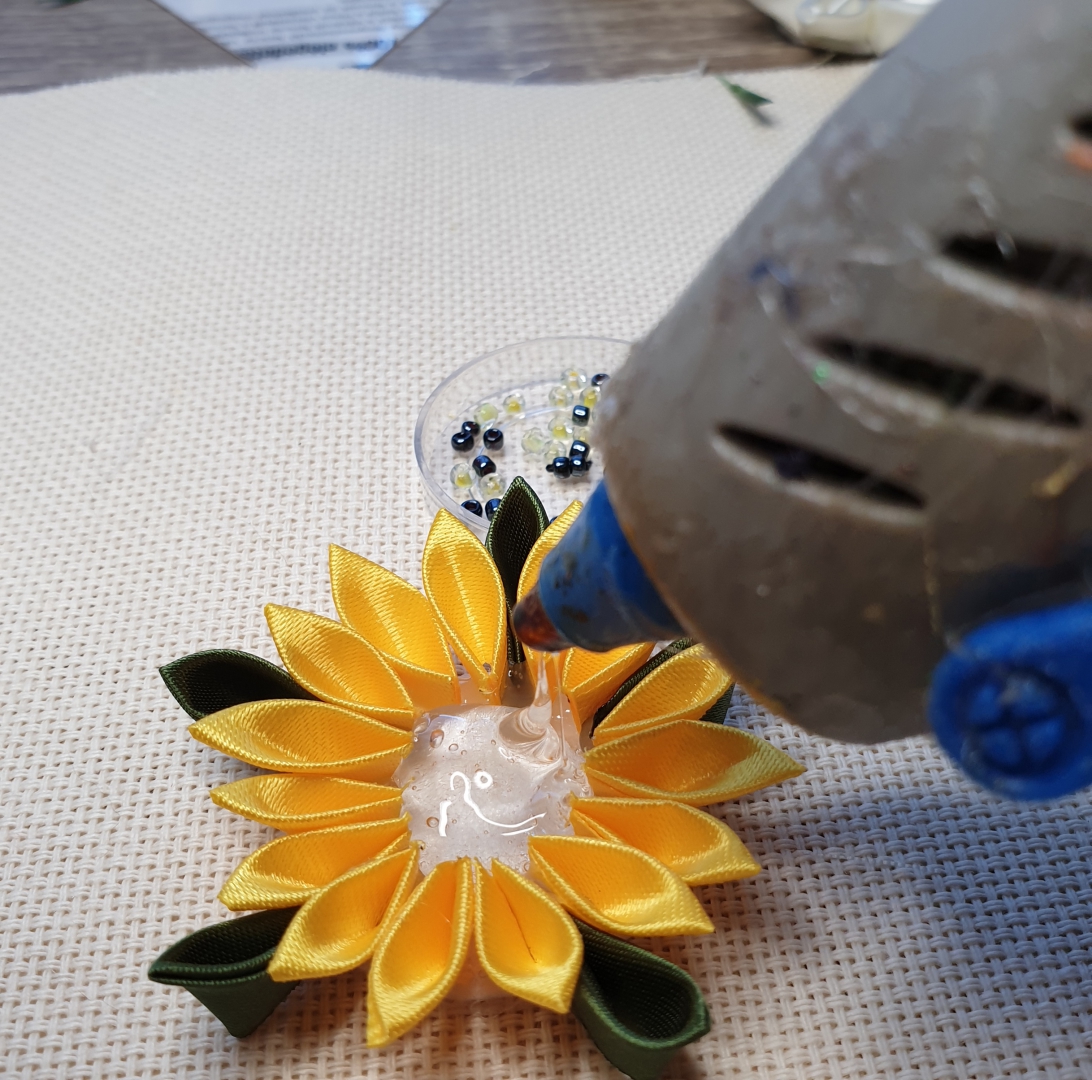 Keverd össze a fekete és sárga kásagyöngyöket egy kiskanálban vagy a műanyag kupakban. A szirmok közötti teret töltsd ki a ragasztópisztolyból kinyomott ragasztóval, és azonnal szórd rá a gyöngyszemeket. A csipesz vagy egy fogpiszkáló segítségével eligazgathatod a ragasztóban a gyöngyöket. Hagyd száradni legalább negyed órát. Fűzd a medált keskeny szaténszalagra vagy bőrpántra.