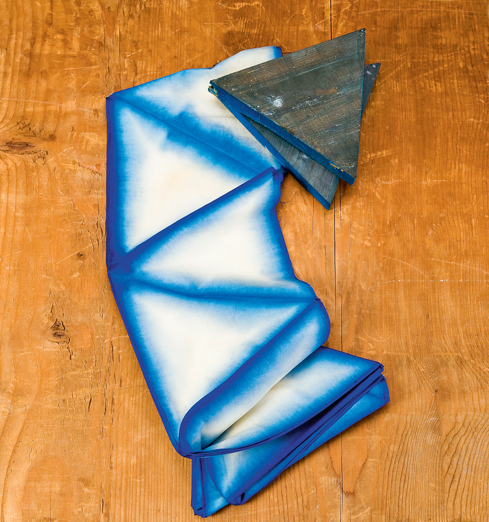 Hajtogasd meg az anyagot harmonikaszerűen hosszában, nyolc részben, és minden hajtásvonalat vasalj le. Hajtogasd a csíkot egyenlő szárú háromszög formára, az éleket itt is vasald le, és szorítsd a falapok közé a „szendvicset". Készítsd el a festőlevet, és mikor már gőzölög, tedd bele az anyagot. Öt-tíz perc után vedd ki, öblítsd le hideg, folyó víz alatt, bontsd szét és újfent öblögesd ki hideg vízben. Szárítás után beszegheted a terítőt.