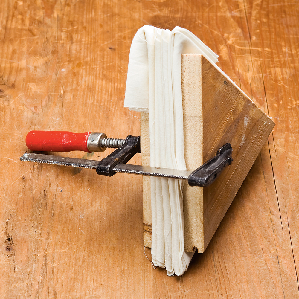 Szorítóforma lehet a legegyszerűbb fa ruhaszárító csipeszből is. Érdemes kipróbálnod, az asztali futónak milyen mintát ad. Hajts hosszában, harmonikaszerűen négyrét egy 40×140 cm-es pamutvásznat, és alaposan vasald le az éleket. Keresztben is hajtsd félbe, majd a csík mindkét végét fel, vissza a hajtásig, szintén levasalva.