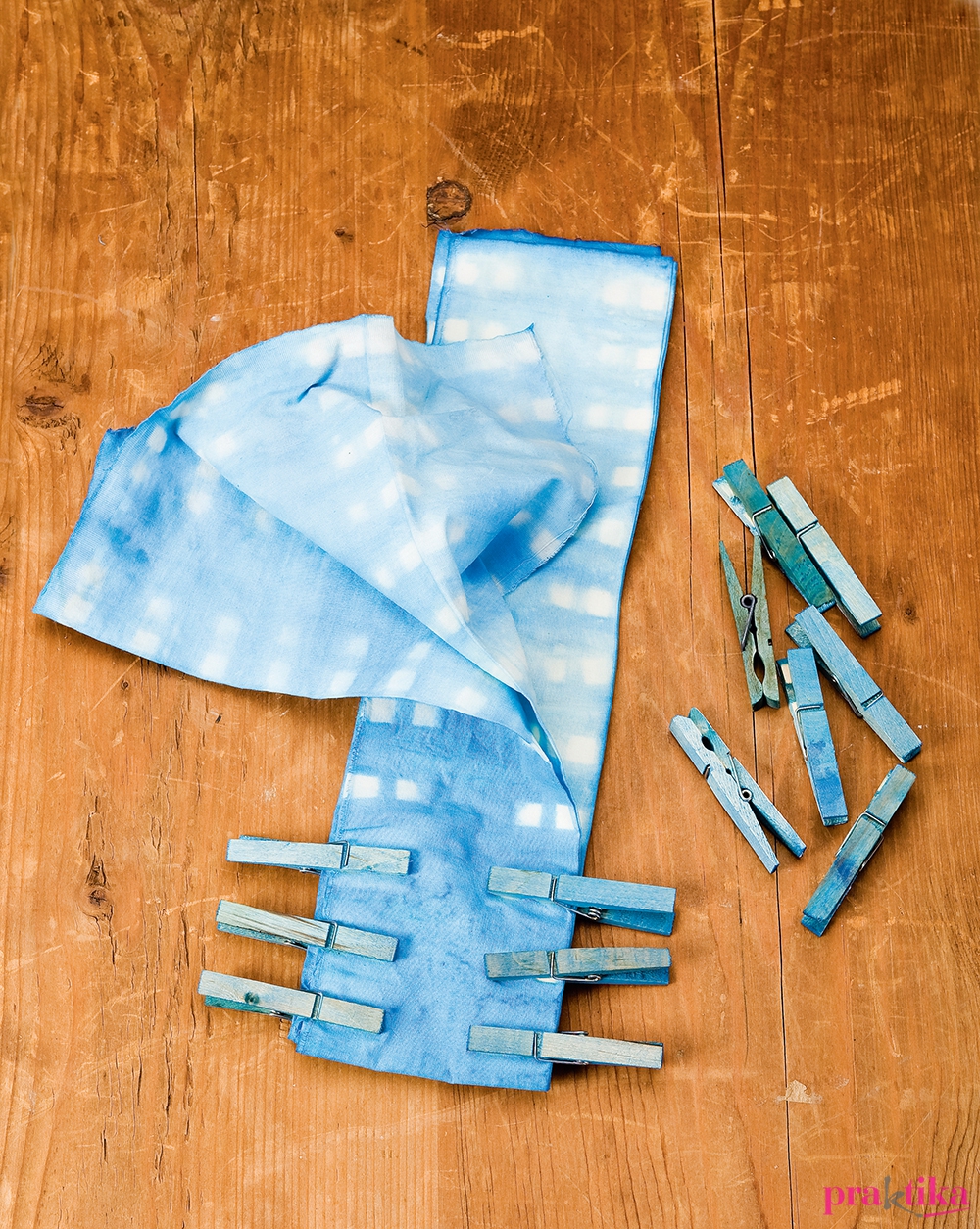 Tedd át a kelmét intenzív színű, gőzölgő festőlébe, tartsd benne 5 percig, majd hideg, folyó víz alatt öblítsd ki. Vedd le a csipeszeket, és széthajtogatás után öblítsd át még egyszer az anyagot, majd szárítsd meg. Már csak el kell szegned a széleket.