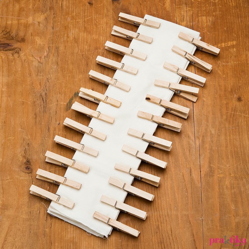 A két hosszanti oldalt fogd össze a 12-12 csipesszel, egyenletesen elosztva. Mivel az anyagot a csipeszek kis helyen szorítják el, most fontos a legalább 5-10 percig tartó, vizes előáztatás. Így a festőlé nem szívódhat be alájuk.