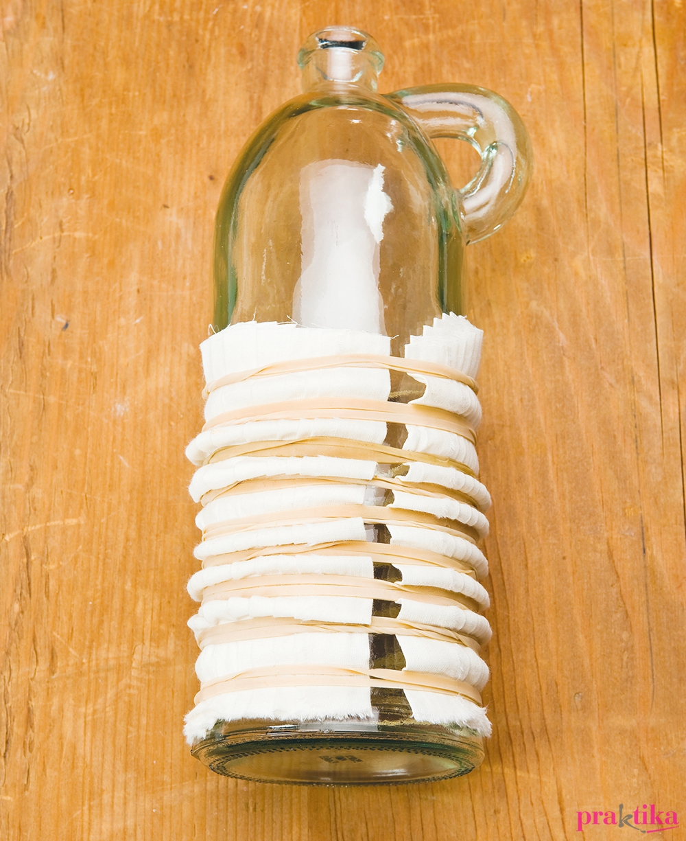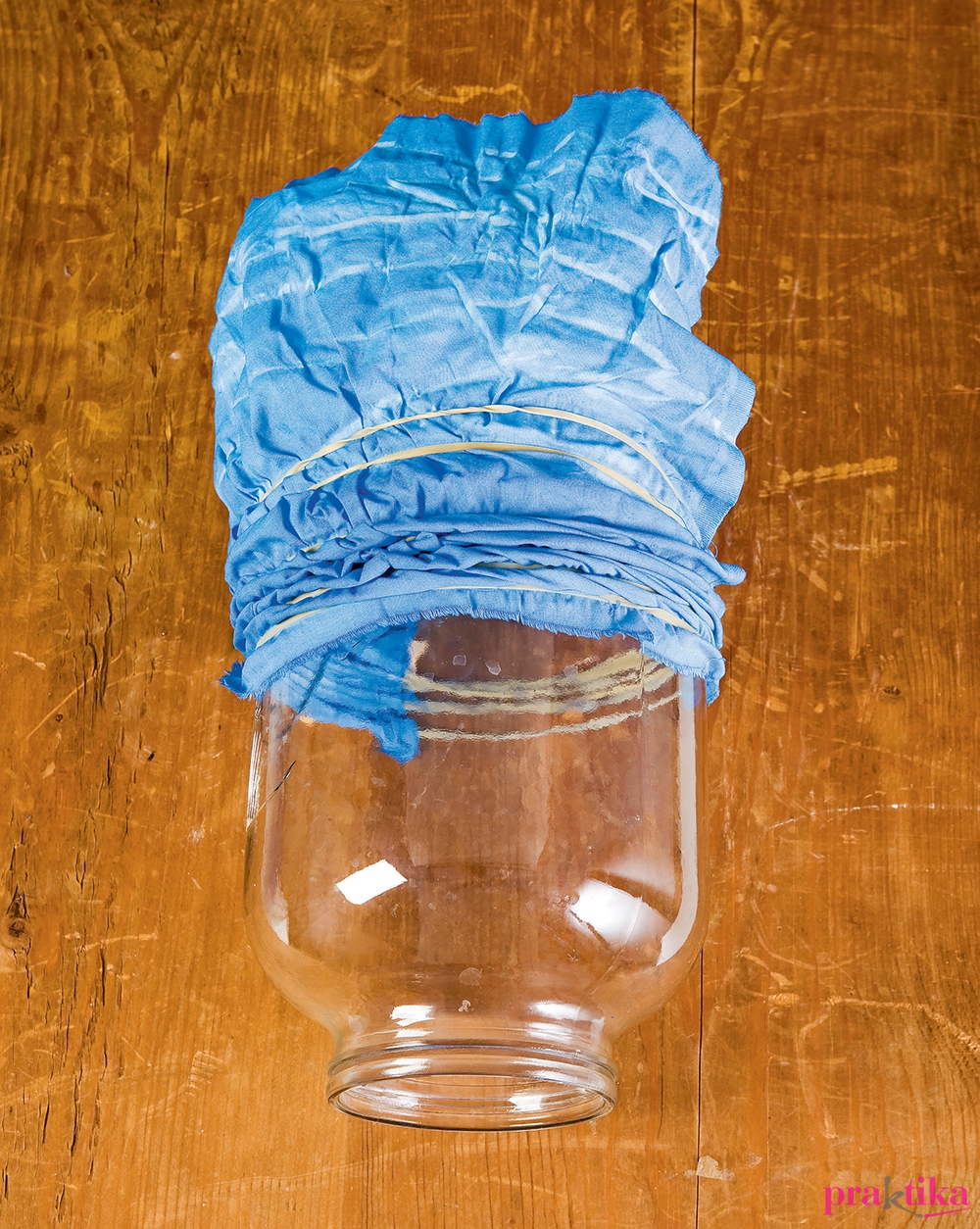Szabj kicsit szélesebb anyagot a kiválasztott üveg kerületénél, és borítsd a palástjára. Alul rögzítsd egy befőttesgumival, majd tőle 4 cm-re tegyél egy újabbat, majd így folytasd felfelé. Végül a vászonnal együtt told le a gumikat, hogy az anyag összegyűrődjön. Töltsd meg az üveget vízzel, és állítsd áztatóvízbe 5 percre, utána kiöntheted a vizet. Most tegyél bele forró vizet, és beleállíthatod a meleg festékfürdőbe (B). 5 perc után kiöblítheted, és a gumikat is leveheted. Jöhet az újabb öblítés és a szárítás.