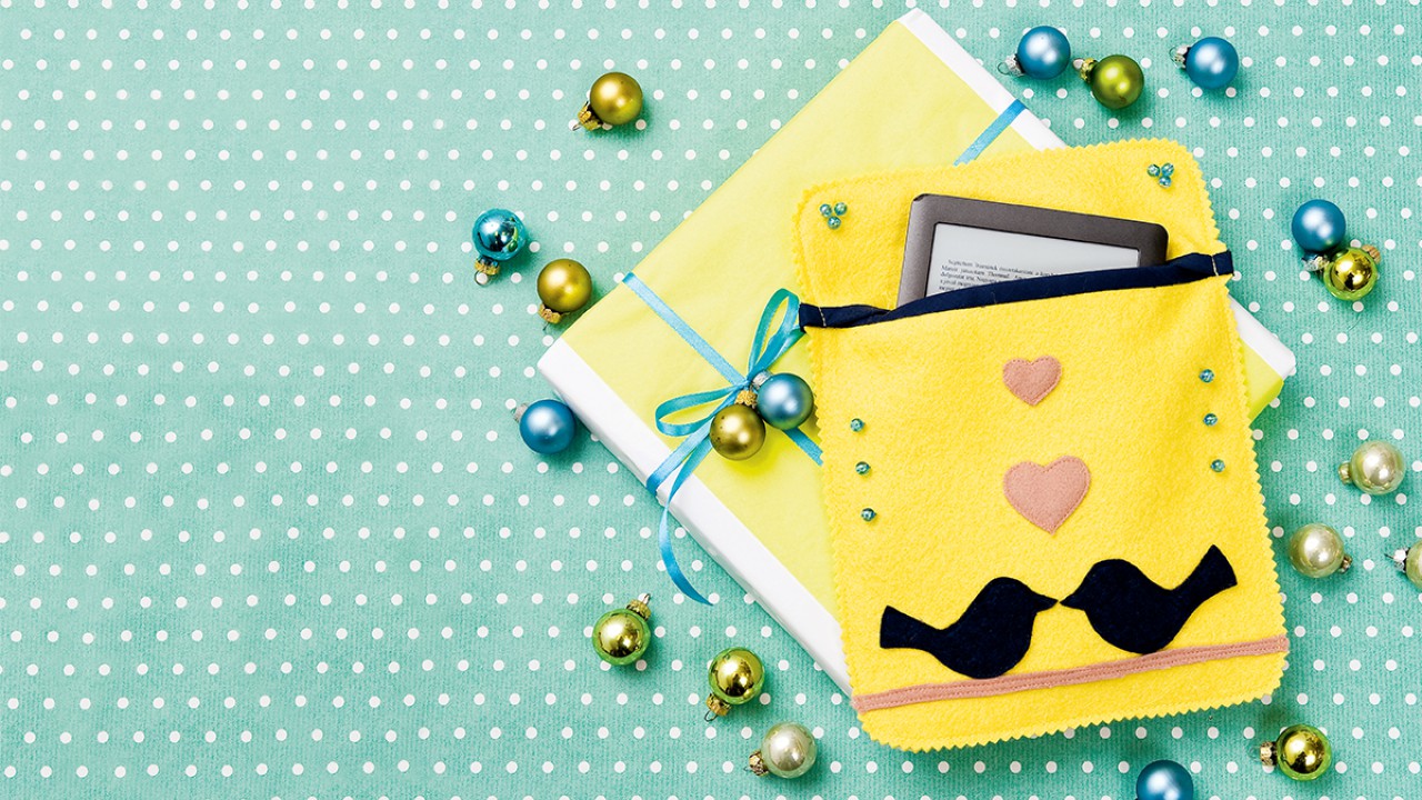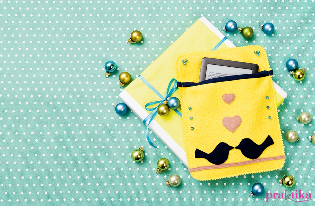 A tok egy 11,5×17,5 cm-es eBook-olvasóé, de ha más méretre készíted a tartót, a szabásmintát igazítsd hozzá: körben 2,5 cm-rel nagyobb legyen az eszközödnél. Vágd ki ráhagyás nélkül a sárga filcből a tok hátlapját, valamint az eleje alsó és felső részét. A színes darabokból szabd ki a díszítő rátéteket.