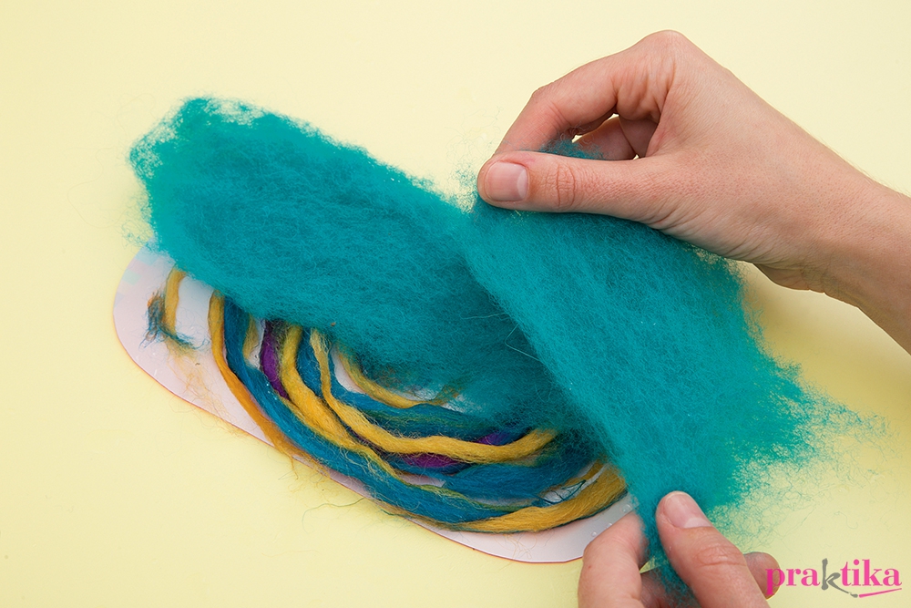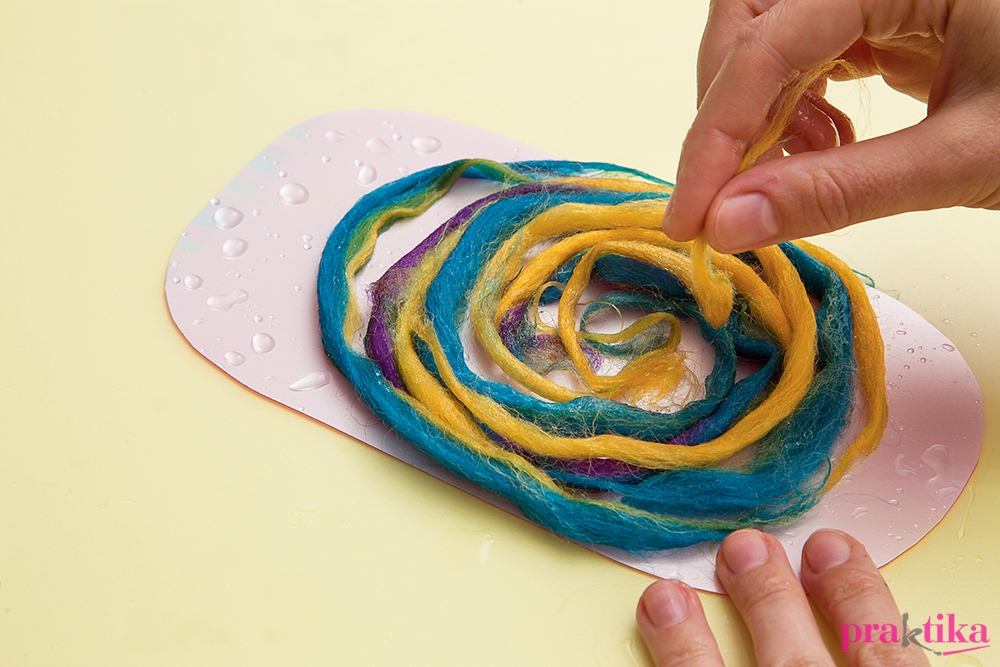Terítsd le az asztalt a fóliával. A műanyag lap sarkait vágd le ívesre. Ezt a legömbölyített sarkú téglalapformát nemezeljük be. Vizezd be a lapot. A mintázásra szánt gyapjúkból sodorj hurkákat. Enyhén nedvesítsd be, és spirálisan tedd a lapra. A türkizzöld gyapjúból tépkedj nagyobb darabokat, és tedd ezeket egymásra merőlegesen a spirálra, több rétegben. Körben a szálak érjenek túl a sablon szélein.