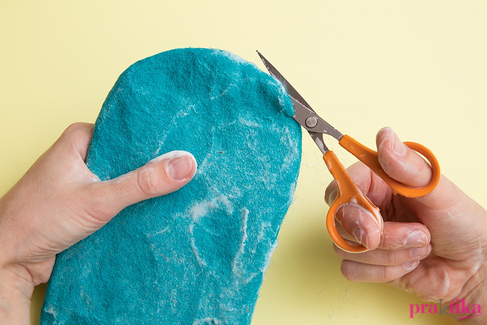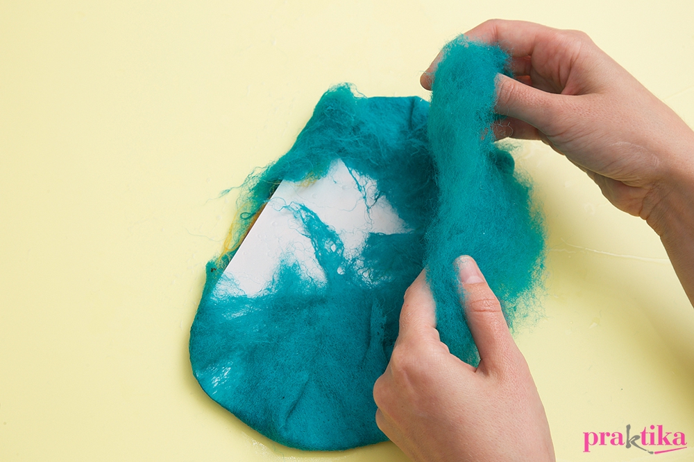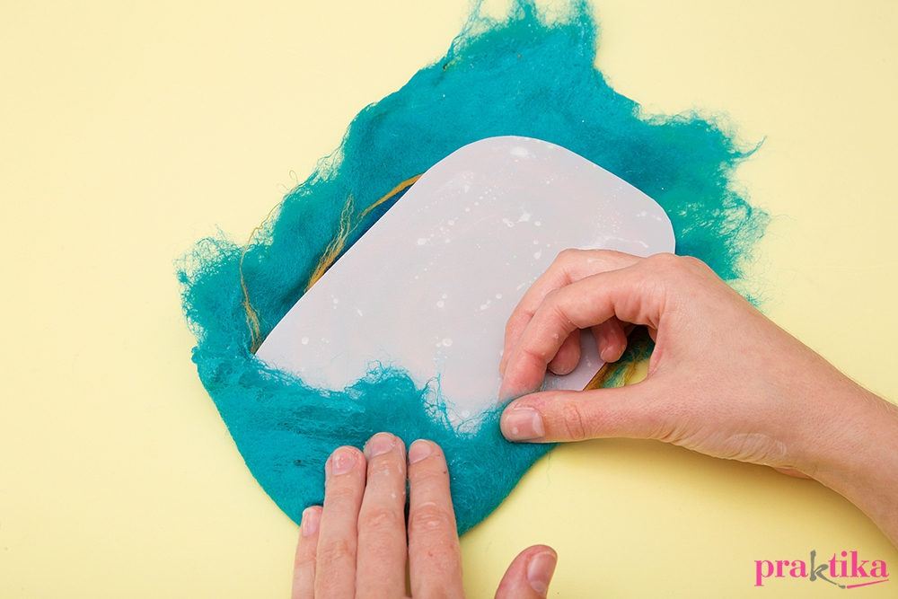 Szappanozd és vizezd be alaposan a rétegelt nemez teljes felületét, óvatosan hajtsd alá a széleket, majd fordítsd meg, és a kilógó részeket hajtogasd rá a műanyag lapra. Burkold be ezt az oldalt is türkizzöld, tépkedett gyapjúval. Nedves kézzel kezdd el dörzsölni, gyúrni a már szappanos-vizes gyapjút. Ahogy összetömörödik az anyag, úgy dolgozhatsz egyre erősebb mozdulatokkal. Amikor eléggé összeállt