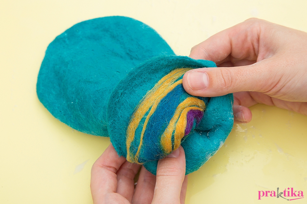 Ezt a külső, mintás részt is nemezeld még egy darabig, hogy jobban rögzüljenek a spirálvonalak. Figyelj, nehogy a két lapot belül összenemezeld, időnként nyúlj közéjük, hogy ellenőrizd a rétegeket.