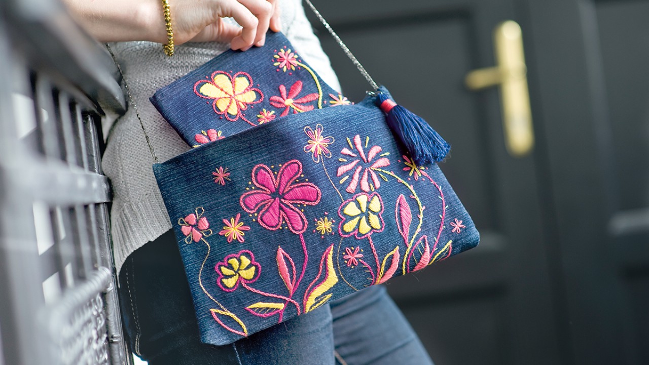 Hozzávalók • farmervászon és pamutvászon 2-2 db 32×20 cm a táskához, 2-2 db 18×18 cm a pénztárcához • táskamerevítő közbélés 2 db 32×20 cm a táskához, 2 db 18×18 cm a pénztárcához • kék cipzár, 30 cm és 16 cm • fehér, kimosható jelölőceruza • osztott hímzőfonal napsárga, lazac, rózsaszín és metál arany színben • tű • hímzőtű • cérna • olló • fekete vagy bronzszínű fémlánc •