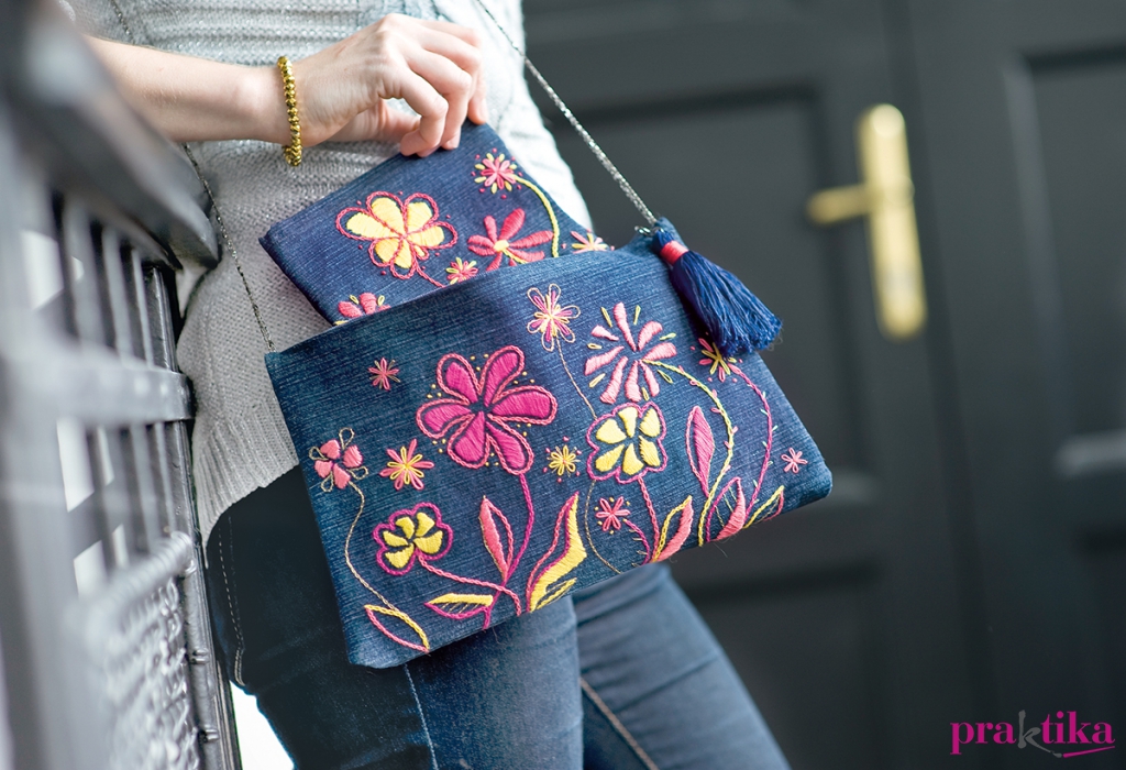 A táska mintáját (a cikk alján találod) a megfelelő méretben rajzold át sütőpapírra, és lyukaszd át a vonalakat tűvel 3-5 mm sűrűn. Tedd a papírt az egyik 32×20 cm-es farmer anyag színére, és a jelölőceruzával a lyukakon keresztül pöttyvonalakkal rajzold át a motívumokat. Már papír nélkül, szabad kézzel erősítsd meg a vonalakat. Hímezd ki a motívumokat a mintáknál megadott öltéstípusokkal és színekkel. Az osztott fonal két szálával dolgozz, az aranyszínű szálból egyet használj.