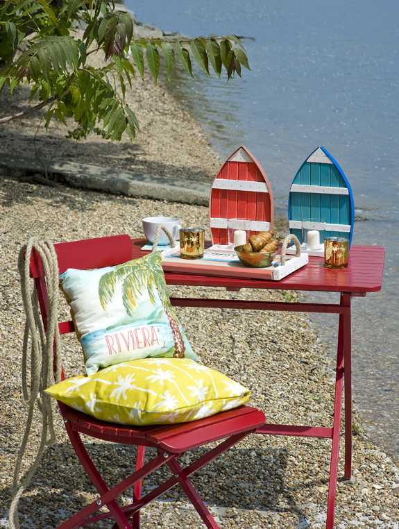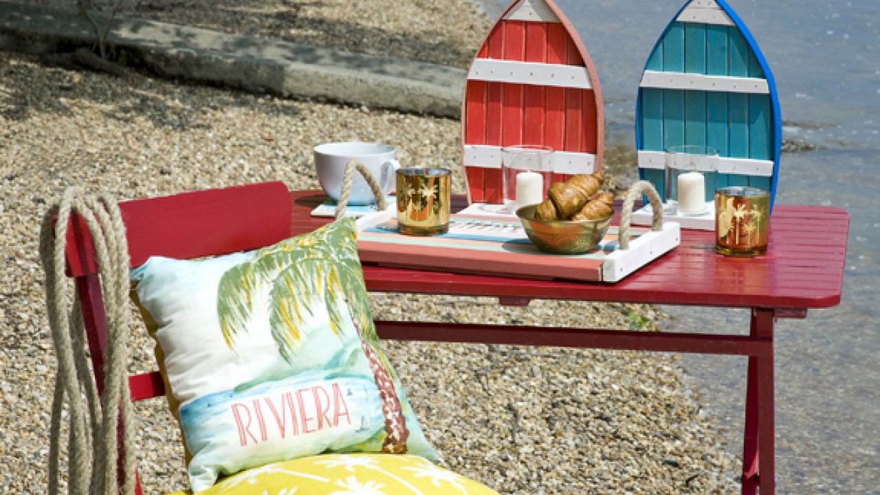 Nem kell nagy művésznek lenned, elég, ha szeretsz festegetni, mert egy kis segítséggel akvarell hatású képet készíthetsz csempelapra az azúr part ihletésében. Megadjuk a vázlatot, amit indigóval másolhatsz fel. Vékony hegyű porcelánfilctollal rajzold át a vonalakat, ezzel megkapod a kontúrokat. Ha vízzel hígítod a porcelánfestéket, hasonlóan tudsz vele dolgozni, mint a vízfestékkel. Lazúrosan színezheted meg a képet, és hagyhatod a színeket egymásba is mosódni – ezzel az élénk színek kissé tompábbak, fakóbbak lesznek. Szükség szerint nedves fültisztító pálcával törölheted vissza a kevésbé sikerült részeket, de ha elégedett vagy a műveddel, hagyd teljesen megszáradni. Nem mindennapi használati tárgy lesz belőle, ha a porcelánfestéket ráégeted a csempére. A festett képedet poháralátétként csodálhatja meg az asztaltársaságotok. A mediterrán házak napszítta, megfakult falainak és spalettáinak ezernyi színárnyalatát úgy érheted el, ha az élénk akrilfestékekbe – sárga, narancs, rózsaszín, bordó – némi fehéret teszel, valamint ezeket is kevergeted egymással. Leheletnyi barna vagy fekete festékkel további ódonságot kölcsönözhetsz nekik. A spaletták kékjeihez és zöldjeihez is hasonló módszerrel közelíts. Ezt a fajta színkeverést akár egyből a tálca falécein is gyakorolhatod, hiszen itt minden sáv más és más árnyalatú lesz. Megfested az egyiket, kis keverés, és máris megszületik egy hasonló. Egy nyári estét apró fényekkel tudsz meghitté tenni, és ha a francia Riviéra kikötőire gondolsz, fokozhatod a hangulatot egy saját készítésű, csónak alakú mécsestartóval. Igazán eredetivé akkor válik a látvány, ha rendhagyó síkba fordítod a ladikot, azaz felállítod. Így lehet jól látni a keskeny lécek kissé kopott, de mégis kontrasztos színeit. Érdemes mindjárt egy kéket és egy pirosat is készítened, mert a fehérrel ez a három szín hozza meg az igazi tengerparti érzést.
