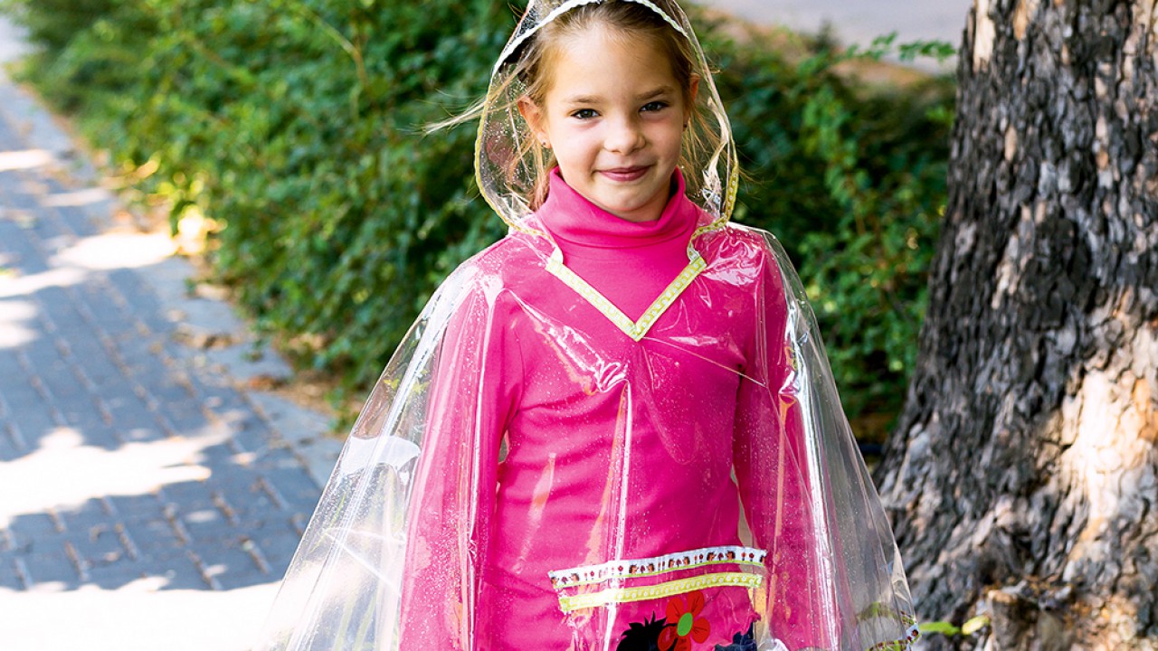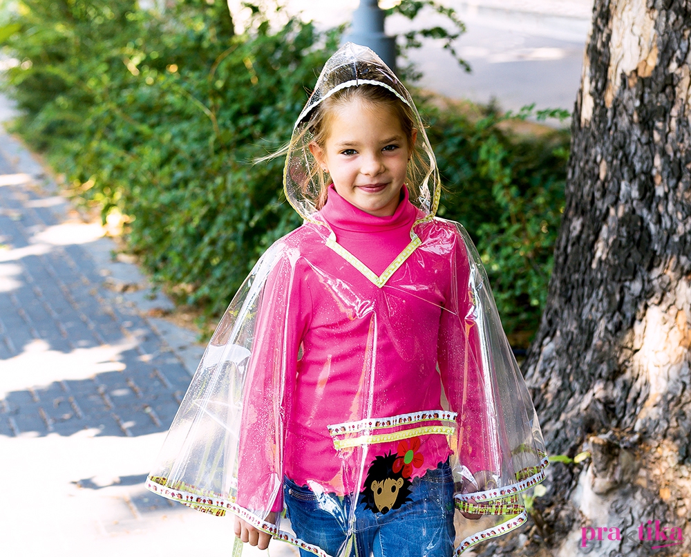 A legtöbb gyerek kifejezetten szeret az esőben szaladgálni, persze ezt csak akkor tehetik gondtalanul és szabadon, ha nem kell esernyővel egyensúlyozniuk. A bebújós esőkabát alatt tágas a hely, ezért kényelmes a viselete. A sokféle mintával kapható szövött vagy ripszszalagok, amelyek a köpönyeg széleit díszítik, a nagyobb motívumokhoz is inspirációul szolgálhatnak. Öntapadó fóliából könnyen kivághatók az egyszerű figurák, melyekkel még egyedibb lesz a saját készítésű esőkabát.