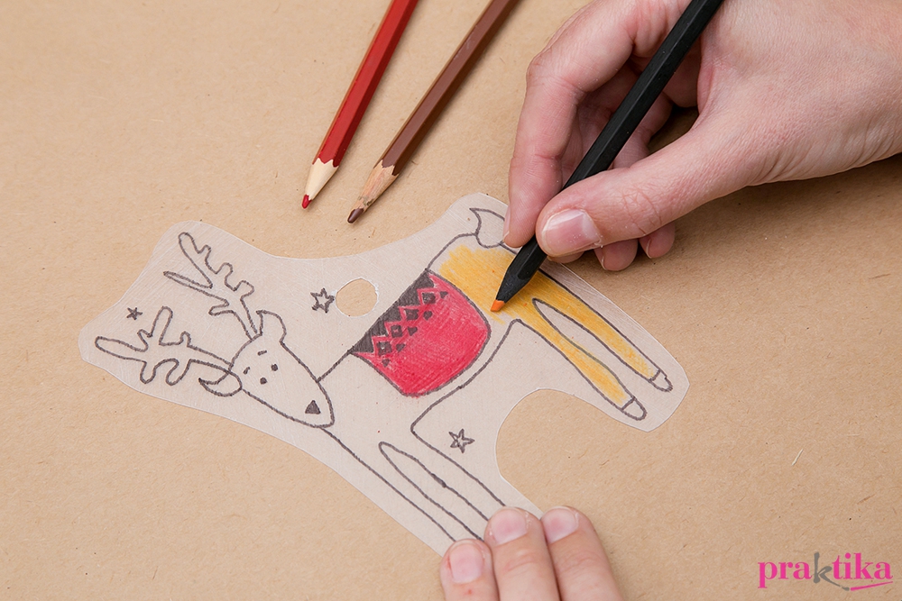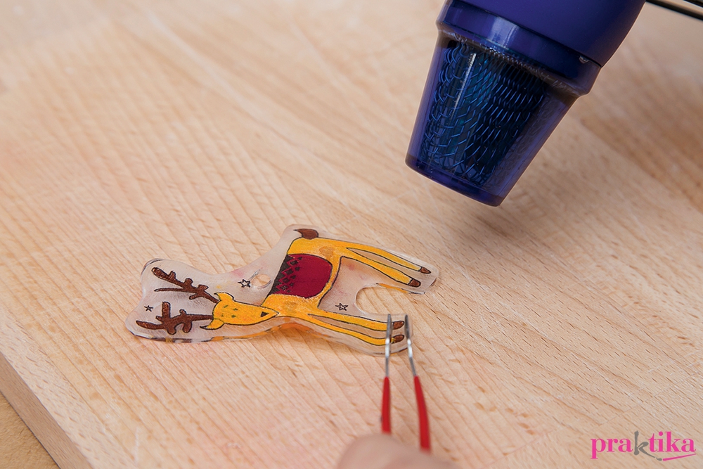 Vágd körbe ollóval a mintát. Nem kell pontosan a vonalon haladnod, hagyj körben bőven szegélyt, legalább 1 cm-t, ami zsugorodás után világos kontúrt ad majd a függőknek. A figurának a felső részét lyukaszd ki, ott, ahová az akasztót szeretnéd befűzni, ha elkészült. Színezd ki a ceruzákkal a részleteket. Hőlégfúvóval zsugorítsd össze a darabot. A meleg levegő hatására a fólia tekeredik, pöndörödik, de amint eléri a végső méretét, szépen kisimul. Zsugorodás közben csipesszel igazíthatsz a széleken, mert ha összeérnek, egymásba ragadhatnak. Ha nincs hőlégfúvód, sütőben is zsugoríthatod a fóliát. Sütőpapírral bélelt tepsiben, 150°C-osra előmelegített sütőben készítheted el. Mikor már újra lapos a fólia, kiveheted a sütőből, és ha kihűlt, belefűzheted az akasztót.