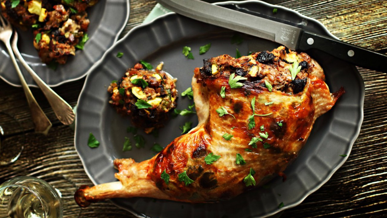 HOZZÁVALÓK: 2 db pulyka hosszúcomb, 50 dkg főtt, hámozott gesztenye, 40 dkg aszalt szilva, 1 nagy cukkini, 4-6 szál zöldhagyma, 2 szikkadt zsemle vagy kifli, 2 tojás, só, bors, őrölt római kömény, 2 dl olaj