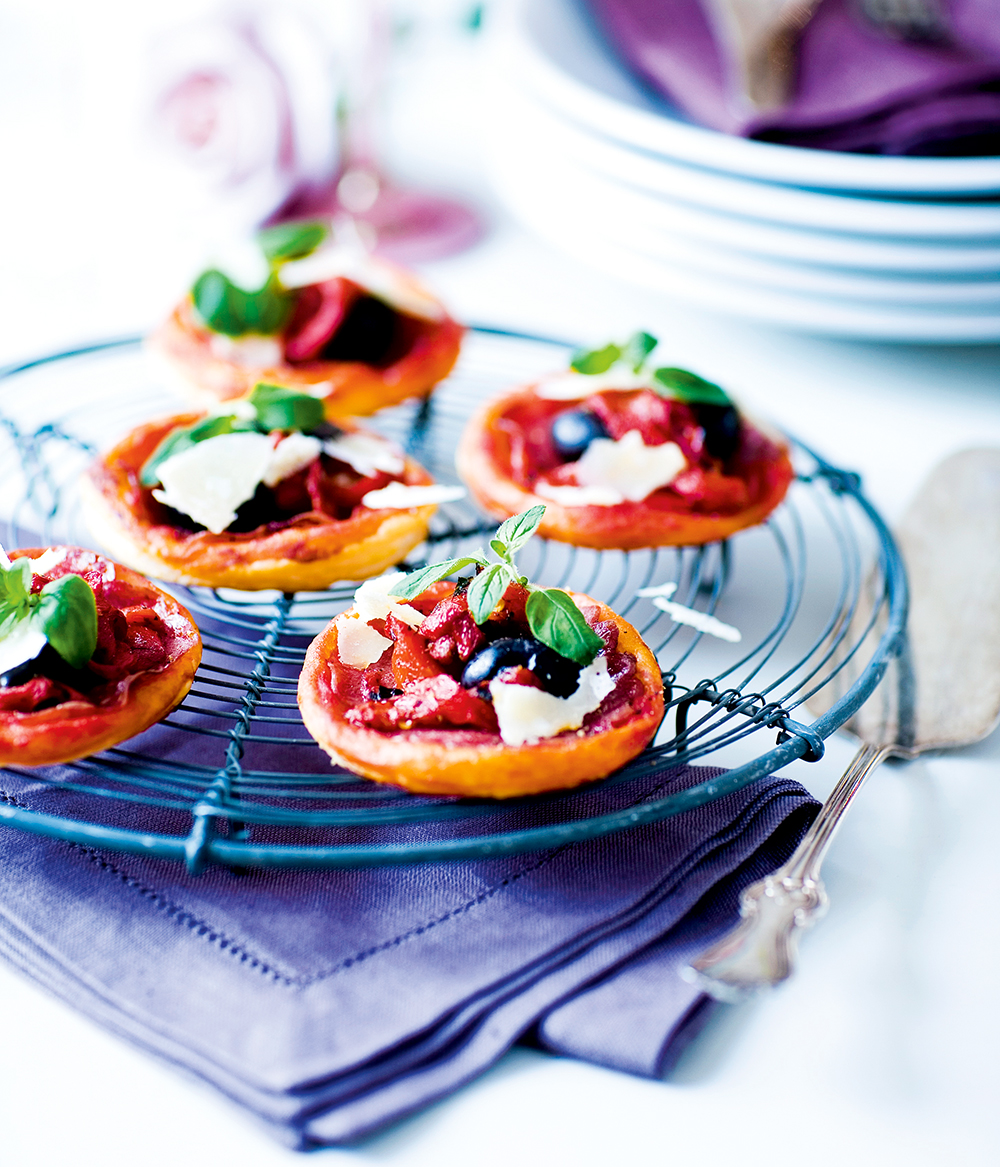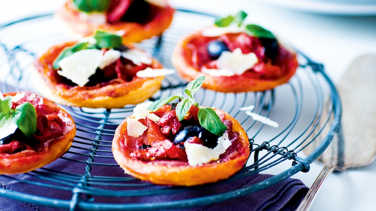 Hozzávalók 8 személyre: 1 csomag leveles tészta, 3 dl paradicsomszósz, 3 kápiapaprika, szalámiszeletek, fekete olajbogyó, 1 gerezd fokhagyma, olívaolaj, durvára reszelt parmezán sajt, friss oregánó, só, bors
