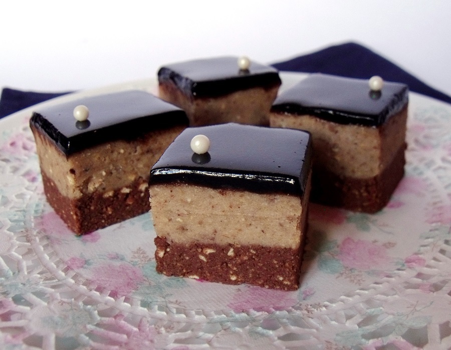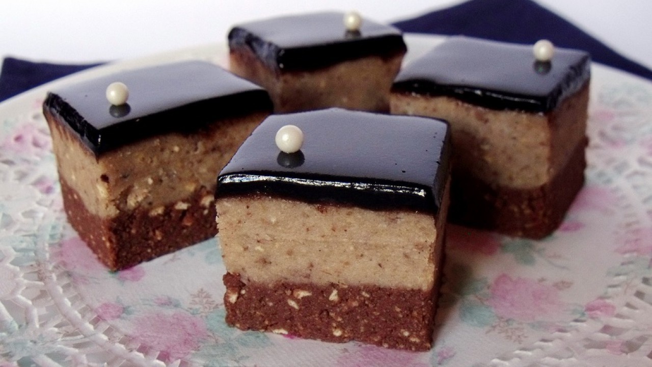A kakaós krémhez a vajat, a porcukrot és a kakaót simára keveri, a rummal ízesíti, a mazsolát is beleszórja. Egyenletesen a diós krémre simítja. Hideg helyen dermedni hagyja. A mázhoz valókat összeforralja, és még melegen a jól megdermesztett kakaós krémre keni. Amint kissé szilárdulni kezd a máz, vékony zsineggel káró alakban bejelöli a szeleteket, úgy, hogy a kakaós-mazsolás krémet ne nyomja össze. Hideg helyre teszi, tálaláskor meleg vízbe mártott késsel vágja fel a szeleteket.